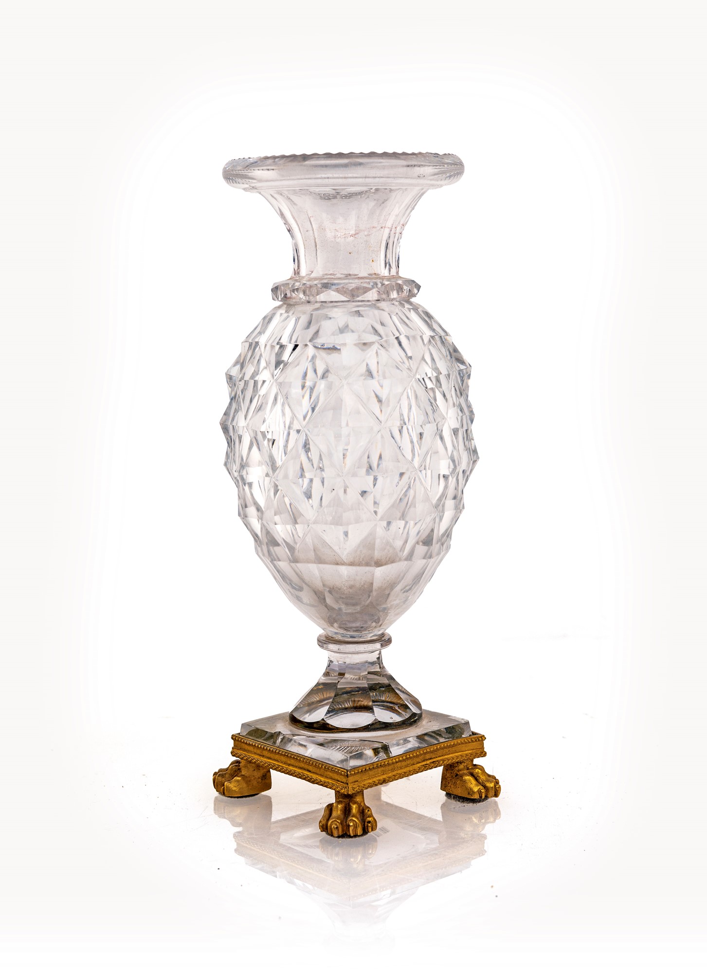 Vasetto in cristallo e bronzo dorato, Francia, XIX secolo corpo a uovo con bugne piramidali, base quadrangolare in bronzo sorretta da piedi ferini. Rotture e piccola mancanza altezza cm 24,5