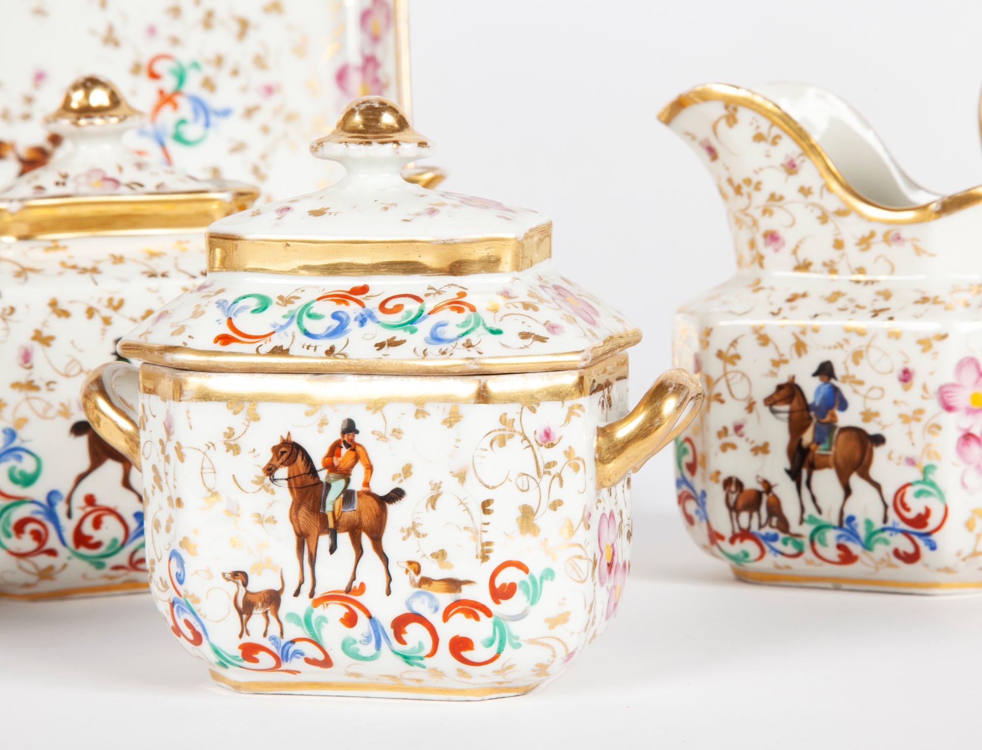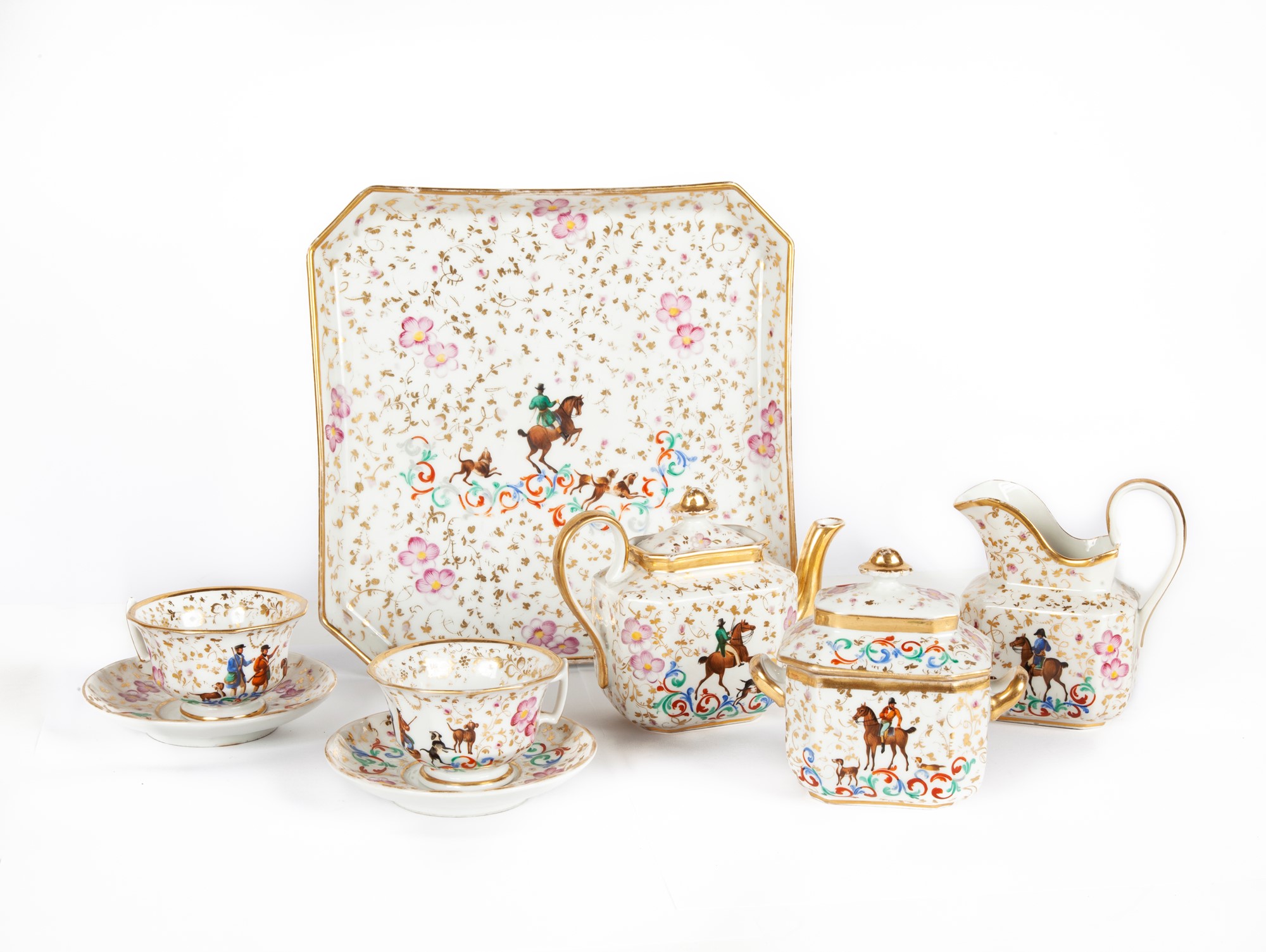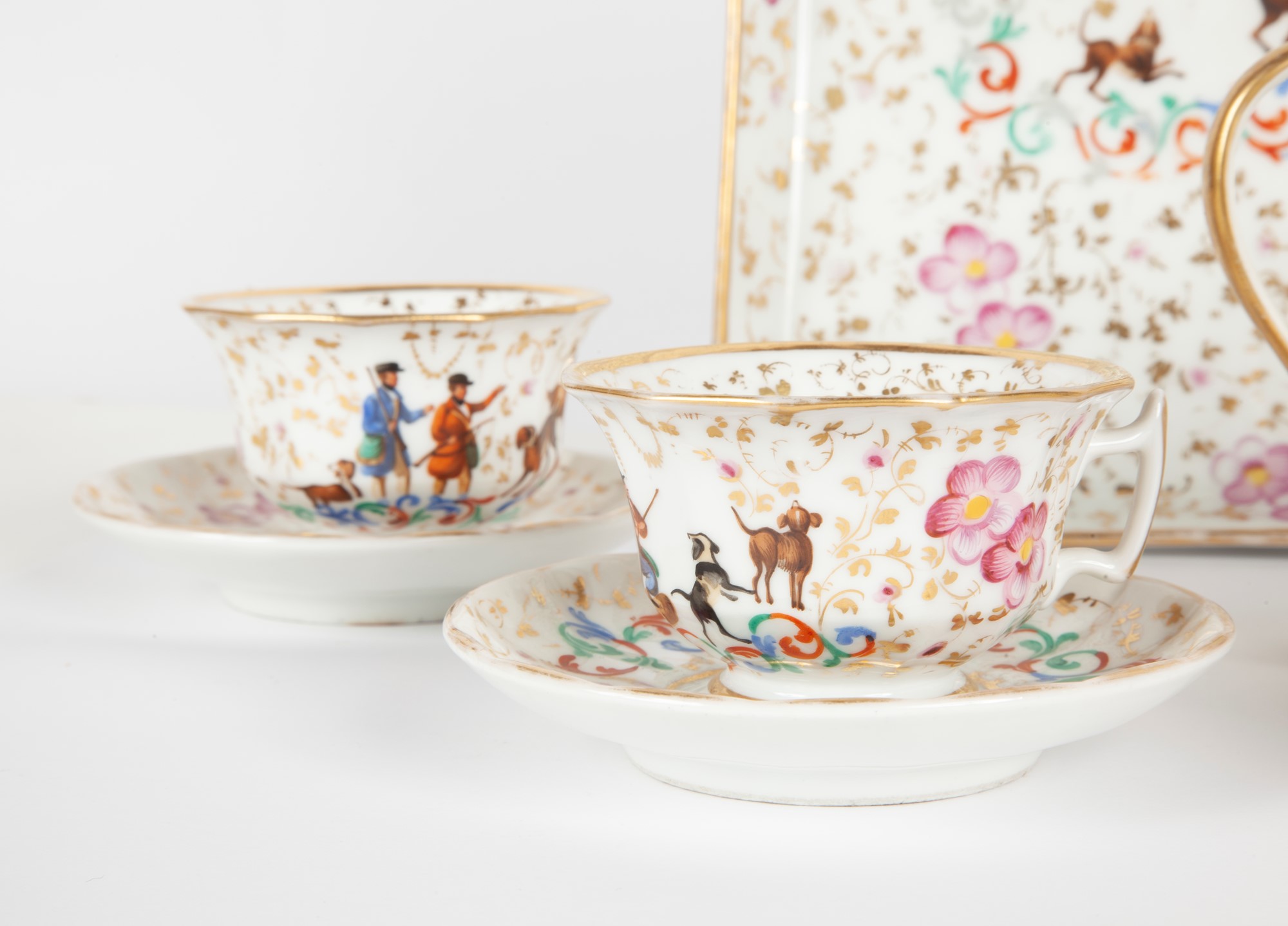 Servizio tete à tete in porcellana con vassoio composto da due tazzine a forma di campana, caffettiera, lattiera, zuccheriera con coperchio ed un vassoio quadrangolare; decorazione policroma con figure di cacciatori a cavallo e cani, circondati da piccoli tralci dorati e corolle amaranto tazzina cm 5,5 - piattino cm 12,5 - caffettiera, lattiera e zuccheriera cm 12 - vassoio cm 26x26