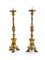 Coppia di torciere in legno dorato, XVIII secolo con fusto a balaustro dominato da piattello reggicero in rame; sostegno cilindrico sorretto da tre piedi ferini altezza cm 92