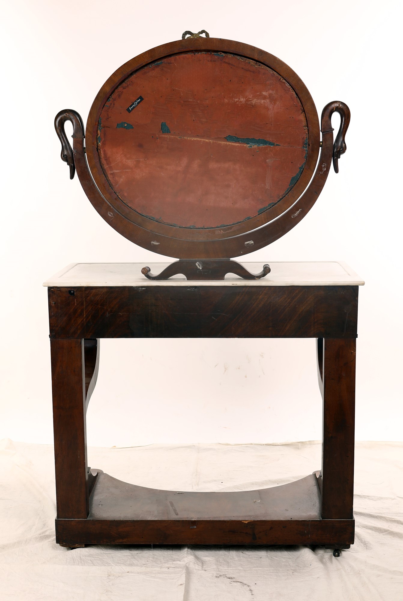 Toletta in mogano d'epoca Impero impreziosita da finiture ornamentali in bronzo dorato; piano rettangolare in marmo bianco sormontato da specchiera a bilico di forma ovale trattenuta da colli di cigno; un cassetto nella fascia cm 135x81x42