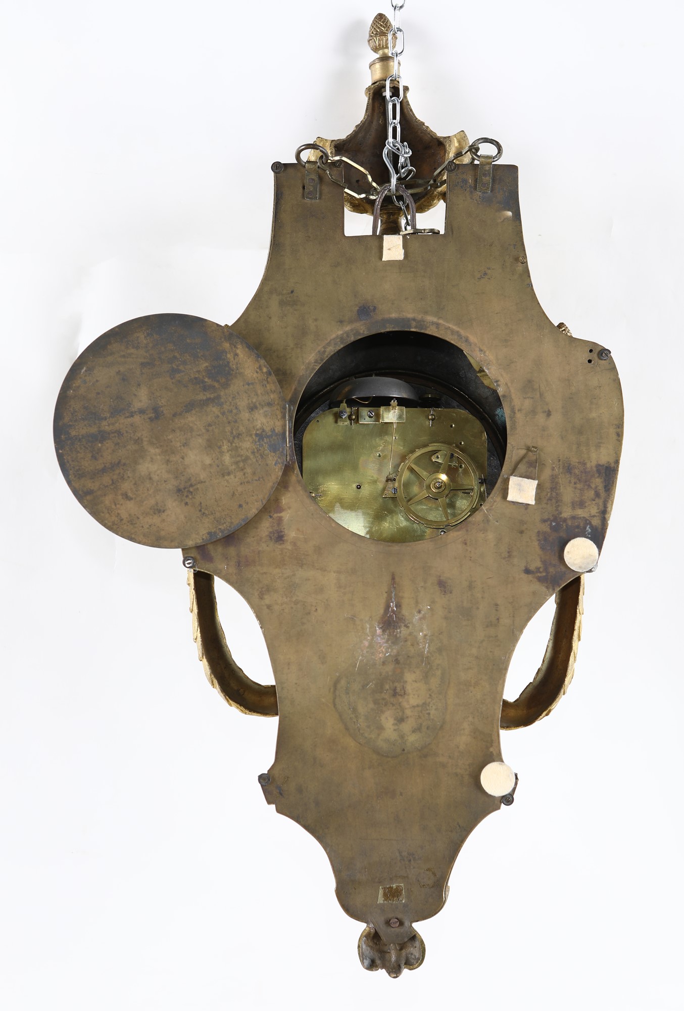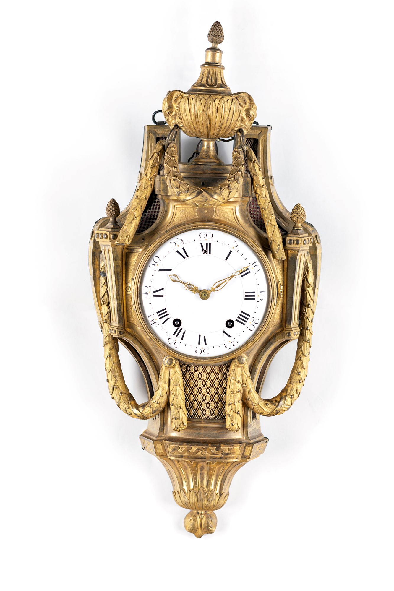 Cartel d'applique in bronzo dorato, Francia, seconda metà XVIII secolo con cassa architettonica sormontata da un vaso da cui discendono ghirlande pendenti; quadrante circolare in smalto bianco a tre fori di carica con fascia oraria a numeri romani ed arabi per i minuti; vertice inferiore a mensola guarnita all'apice da un cespo fogliaceo. Rottura al vetro cm 74x32x13