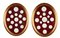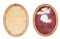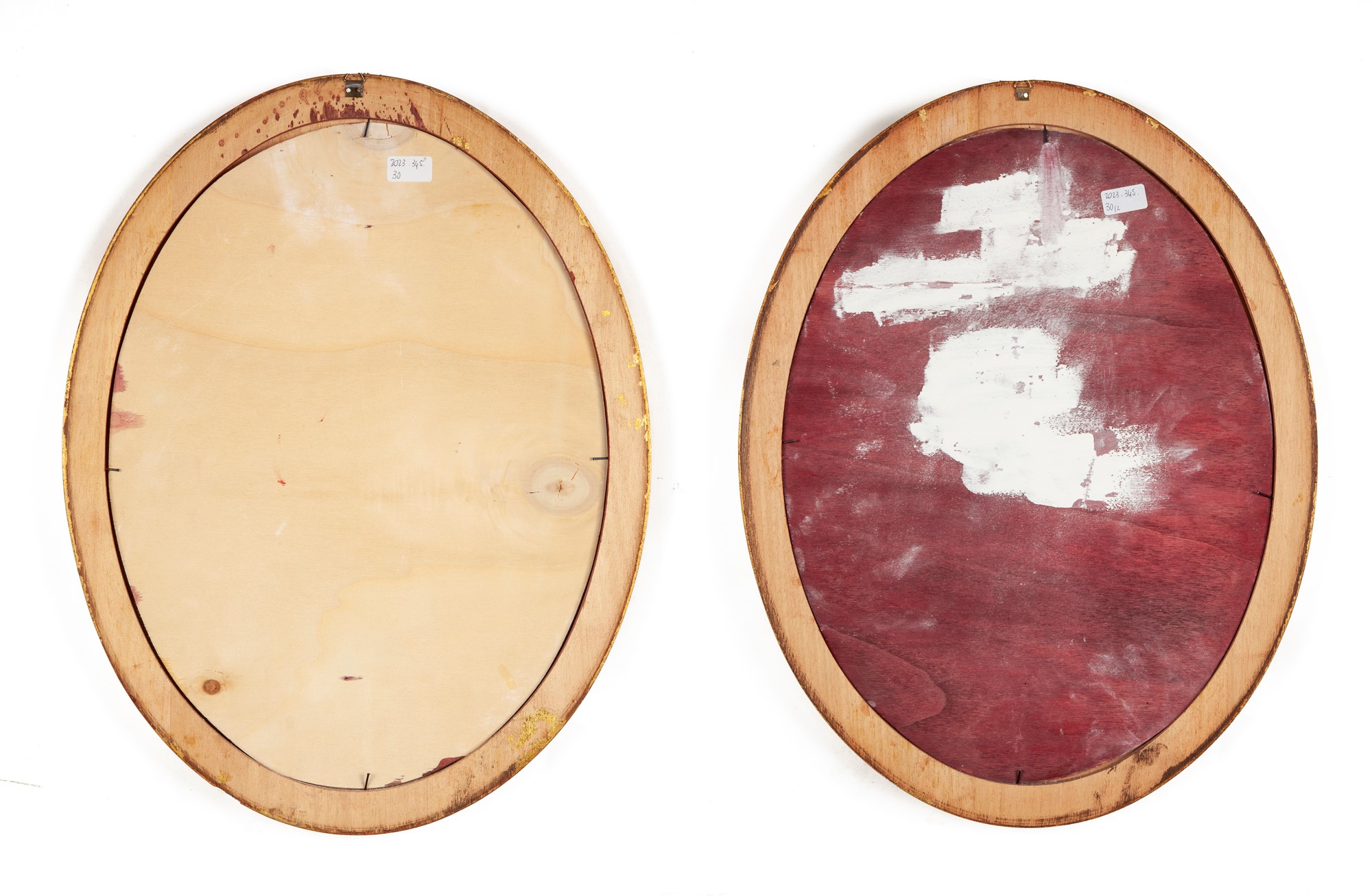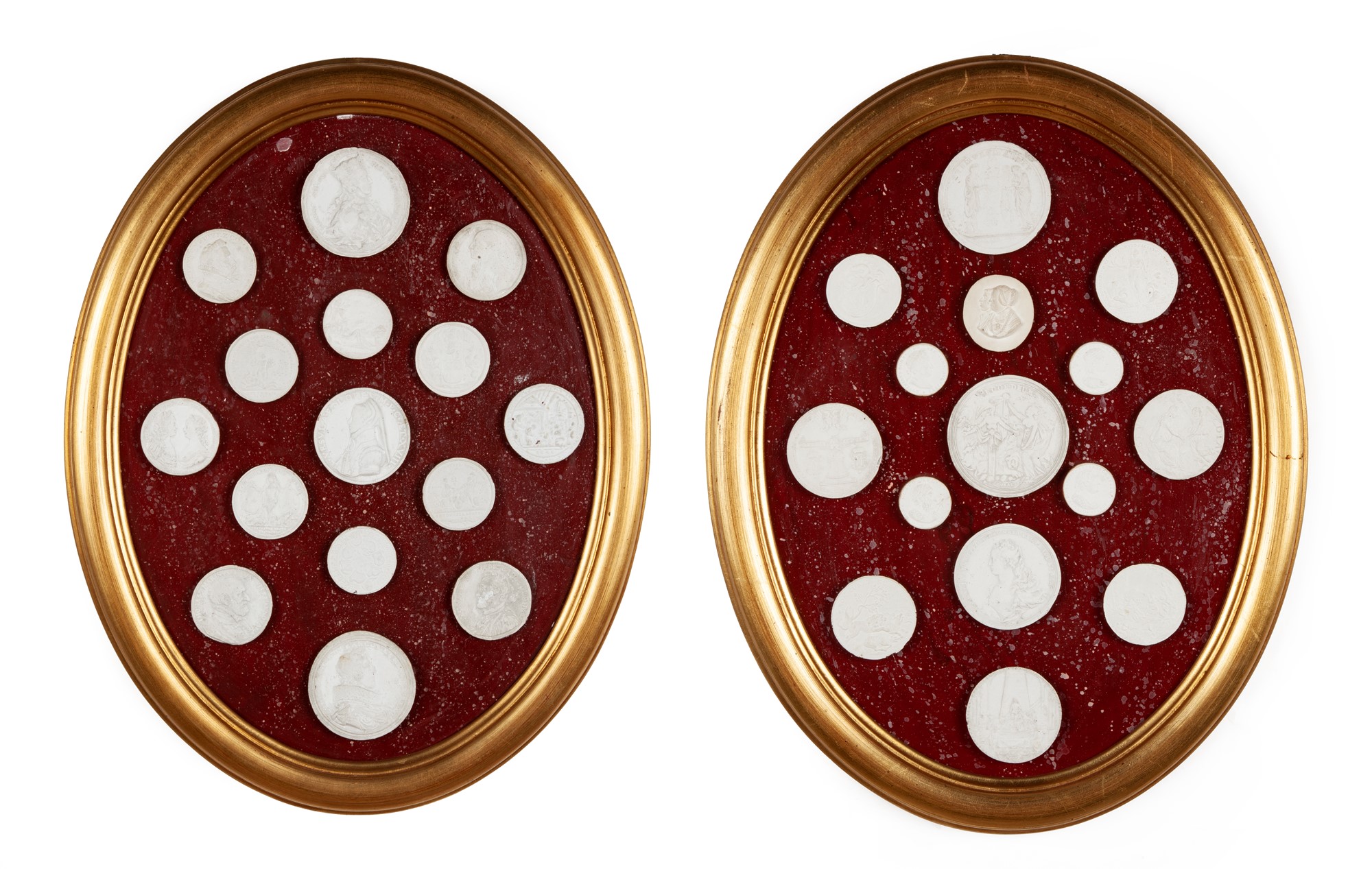 Raccolta di calchi in gesso per camei entro due cornici ovali in legno dorato, XIX secolo ogni quadro contiene quindici camei applicati su fondo dipinto ad imitazione del porfido cm 46x35