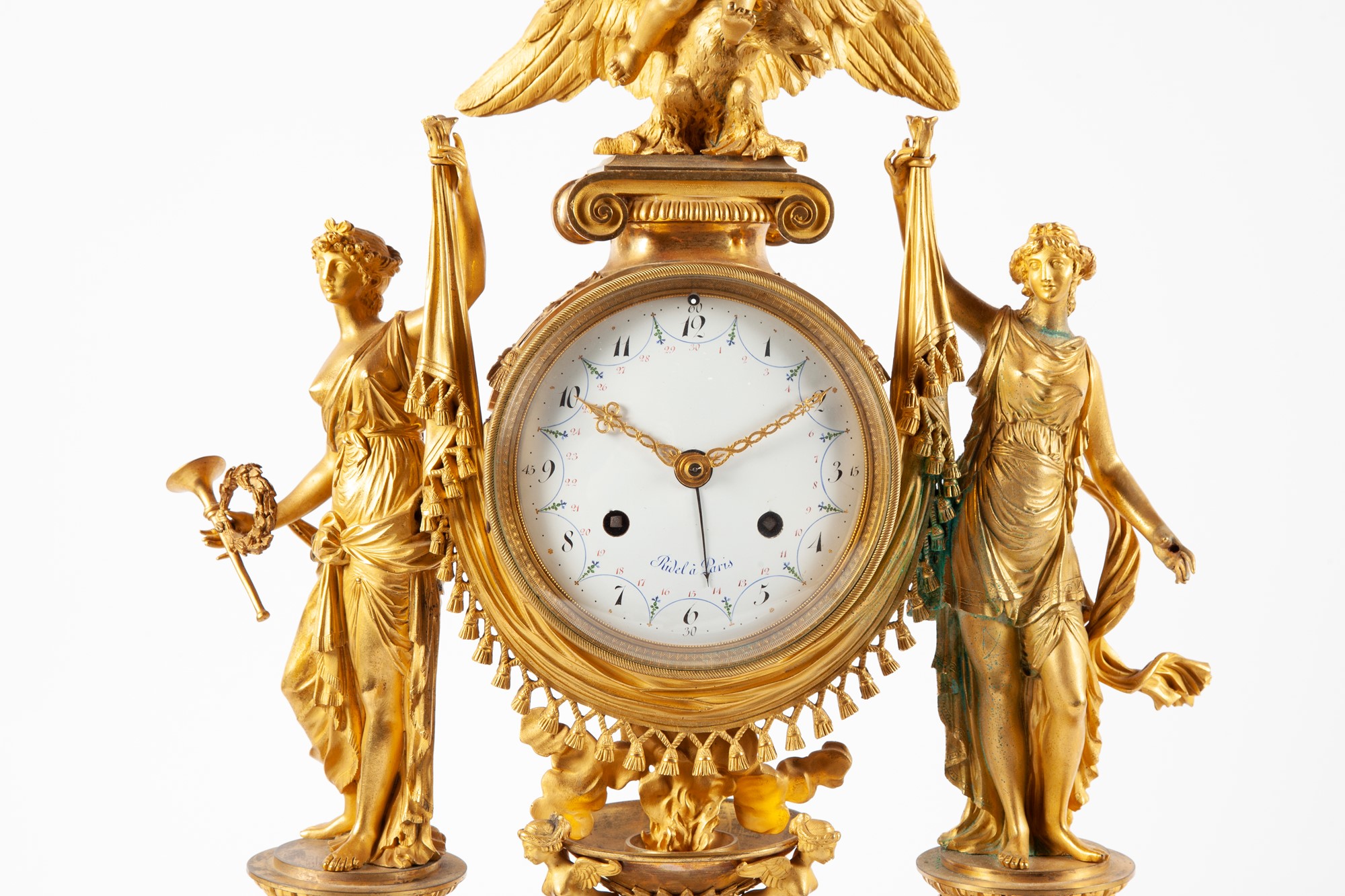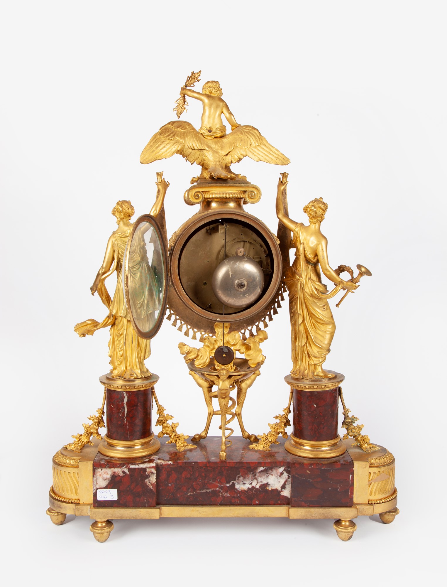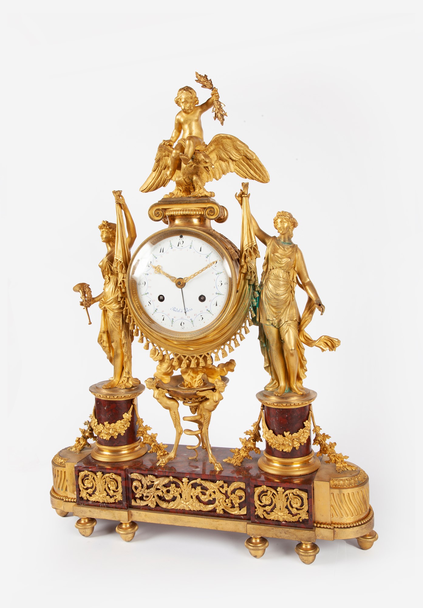 Orologio da camino Luigi XVI in bronzo dorato e marmo rouge griotte, Francia, fine del XVIII secolo cassa circolare sorretta da tripode e sormontata da un capitello dominato da rapace cavalcato da amorino, con quadrante in smalto bianco a due fori di carica con indicazione oraria a numeri arabi, firmato Ridel à Paris; ai lati figure muliebri a tutto tondo su mezze colonne guarnite da festoni in bronzo cesellato; base in marmo su piedi a trottola cm 67x50x12