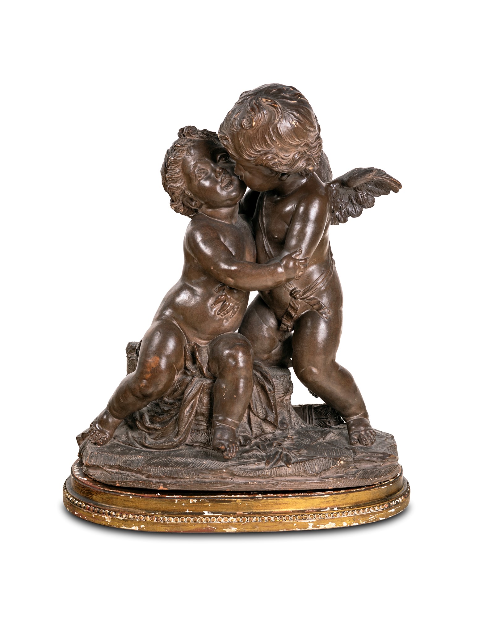 Gruppo in terracotta con Amore e Psiche dall'originale di Claude-Augustin Cayot, Francia, XIX secolo Firmato Augustin Cayot; base in legno. Poche sono le opere di Cayot; si veda per confronto l'Amore e Psiche in marmo, firmato e datato 1706, oggi nella Wallace Collection di Londra, raffigurato in: The Wallace Collection, Sculpture, p. 7 e Suppl. p. 22 terracotta altezza cm 58 - cm 62x50x22