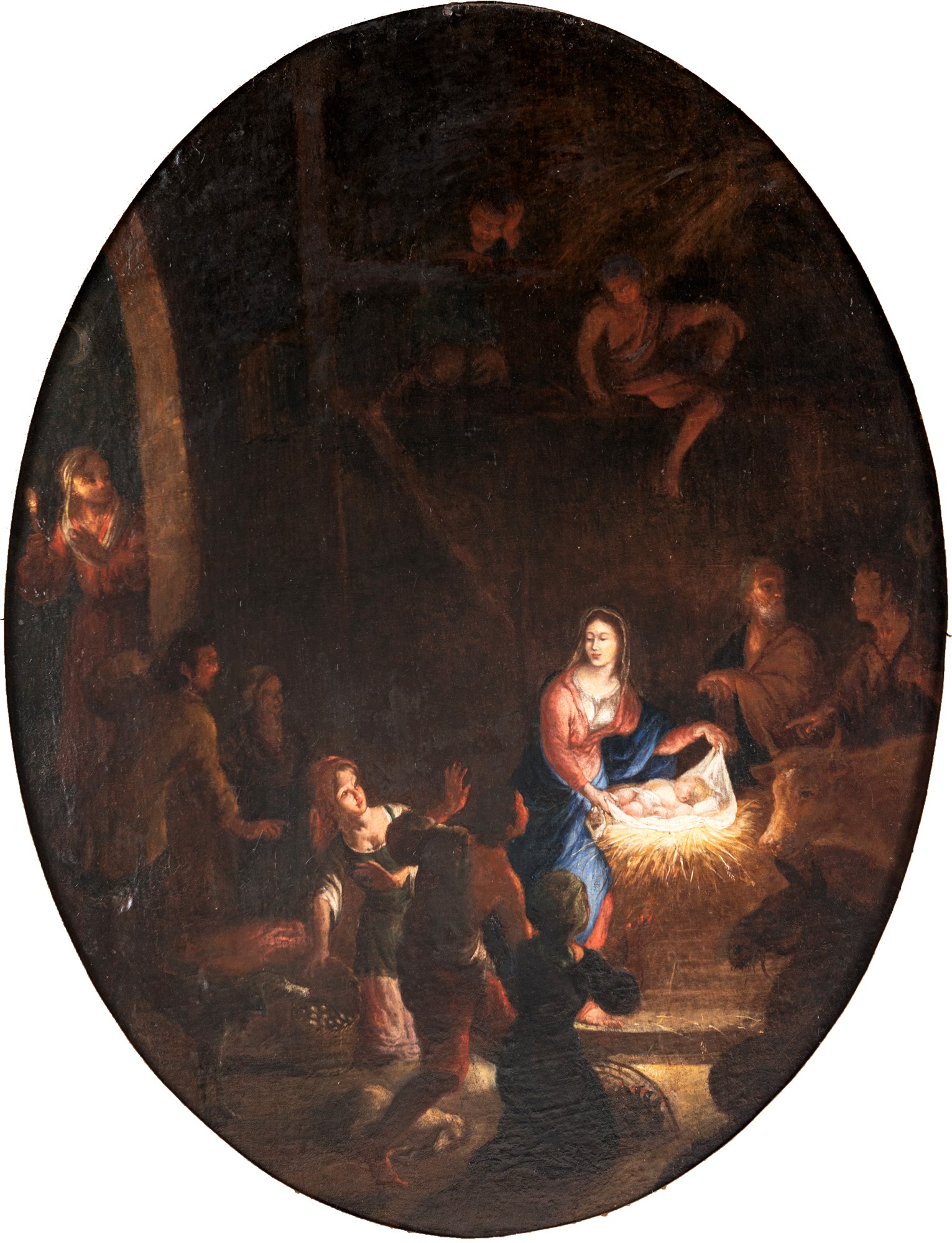 Scuola Fiamminga del XVII secolo 0-0 Natività ovale olio su tavola cm 86x68 - con cornice cm 100x80