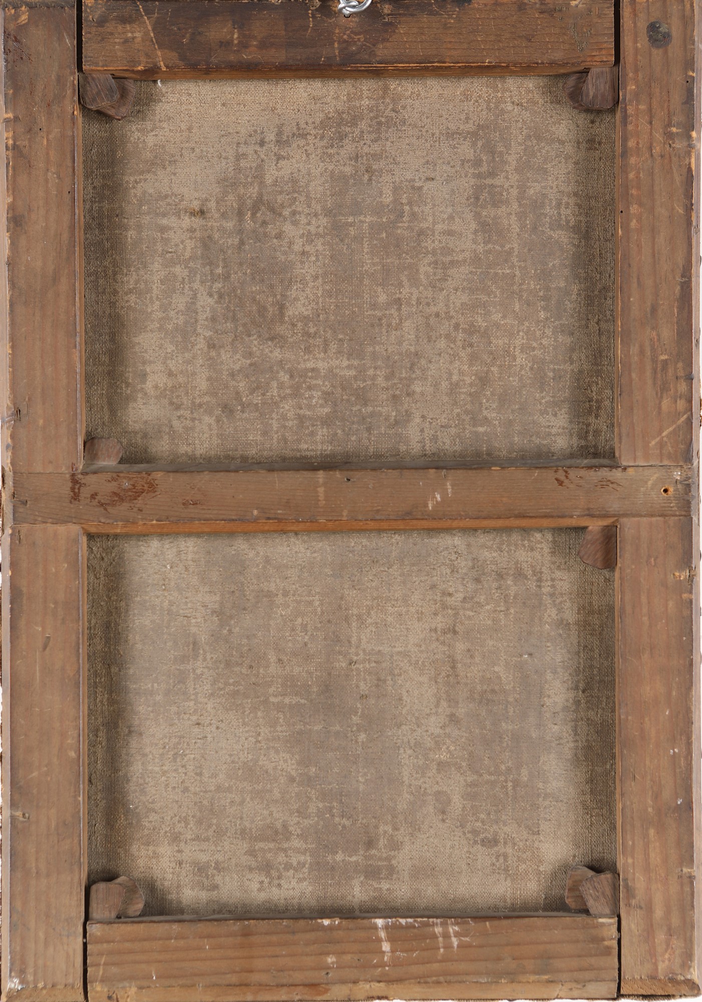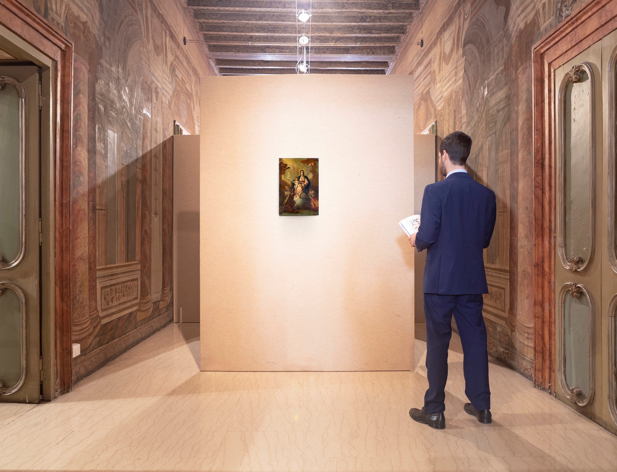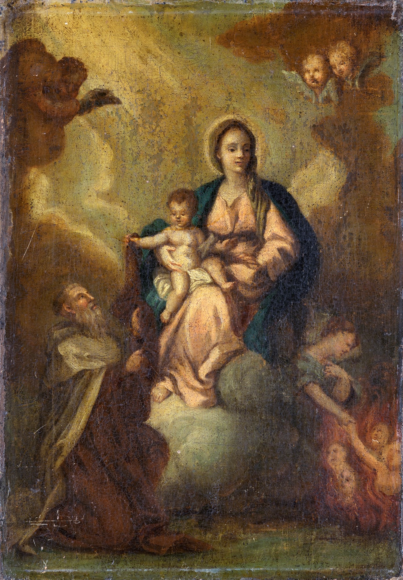 Scuola napoletana del XVII secolo Madonna col Bambino, angeli e Santi La Madonna, seduta su un trono di nuvole col Bambino in braccio; ai loro piedi, a sinistra San Filippo Neri e a destra fanciulli olio su tela cm 48,5x34,5 s.c.