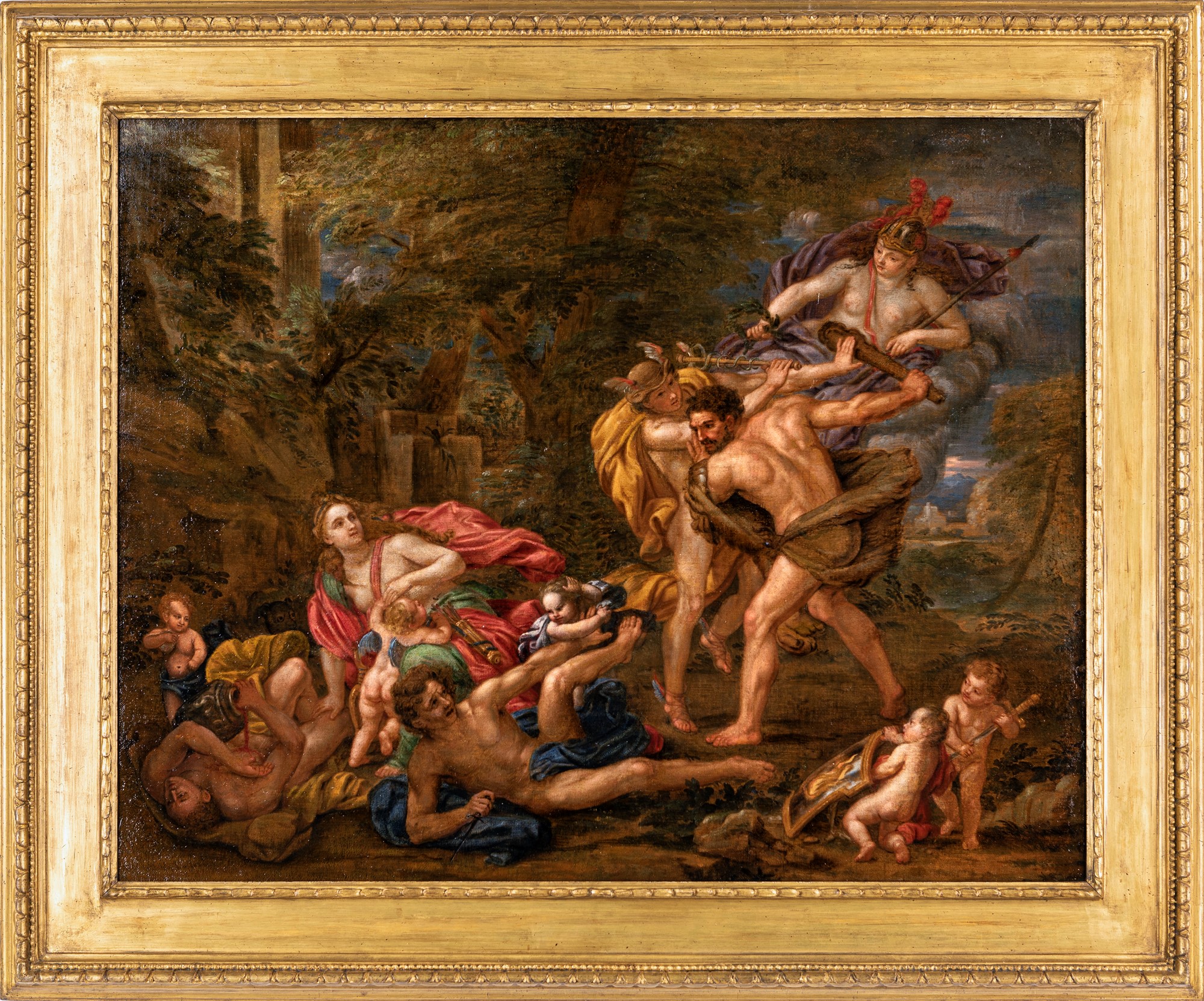 Scuola Romana del XVIII secolo Minerva incorona Ercole accompagnato da Mercurio olio su tela cm 78x96 - con cornice cm 100x120