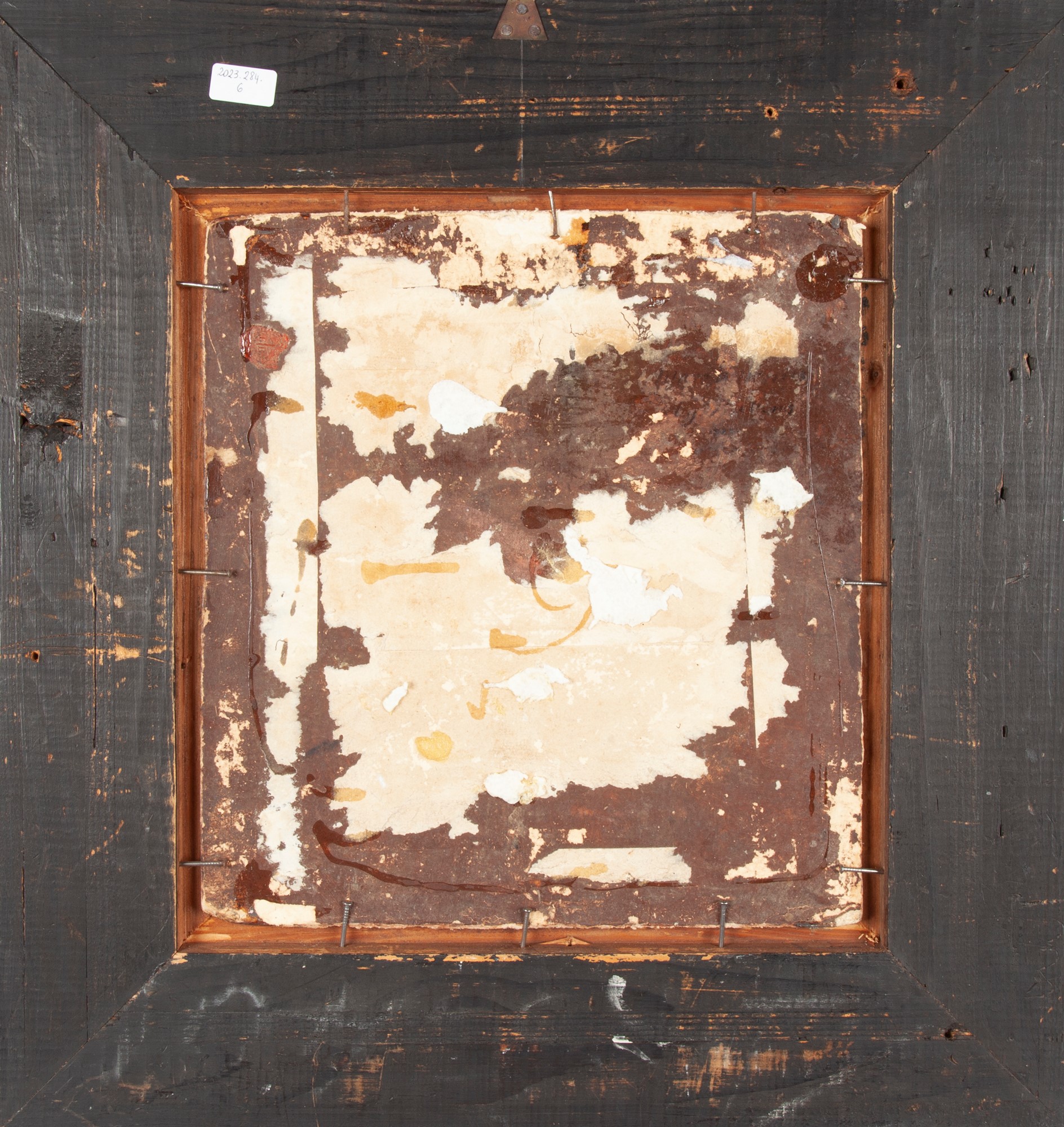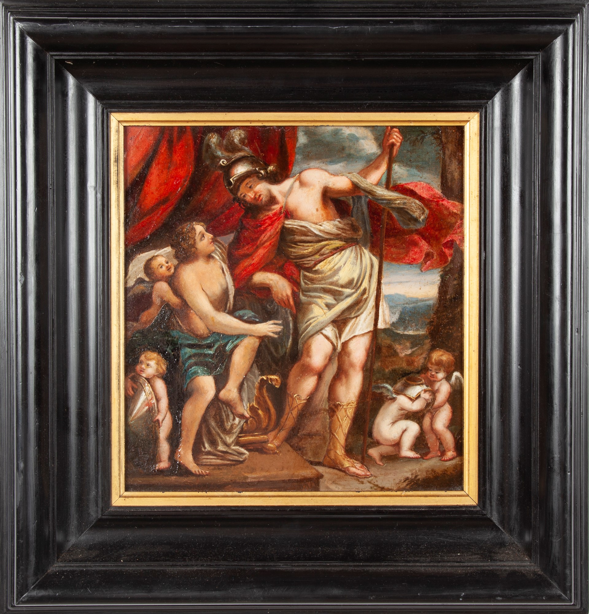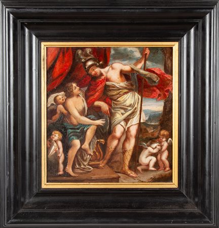Pittore Romano del XVIII secolo Venere offre le armi ad Enea Al verso timbro di collezione in ceralacca olio su cartone cm 30x28 - in cornice cm 49,5x46,5