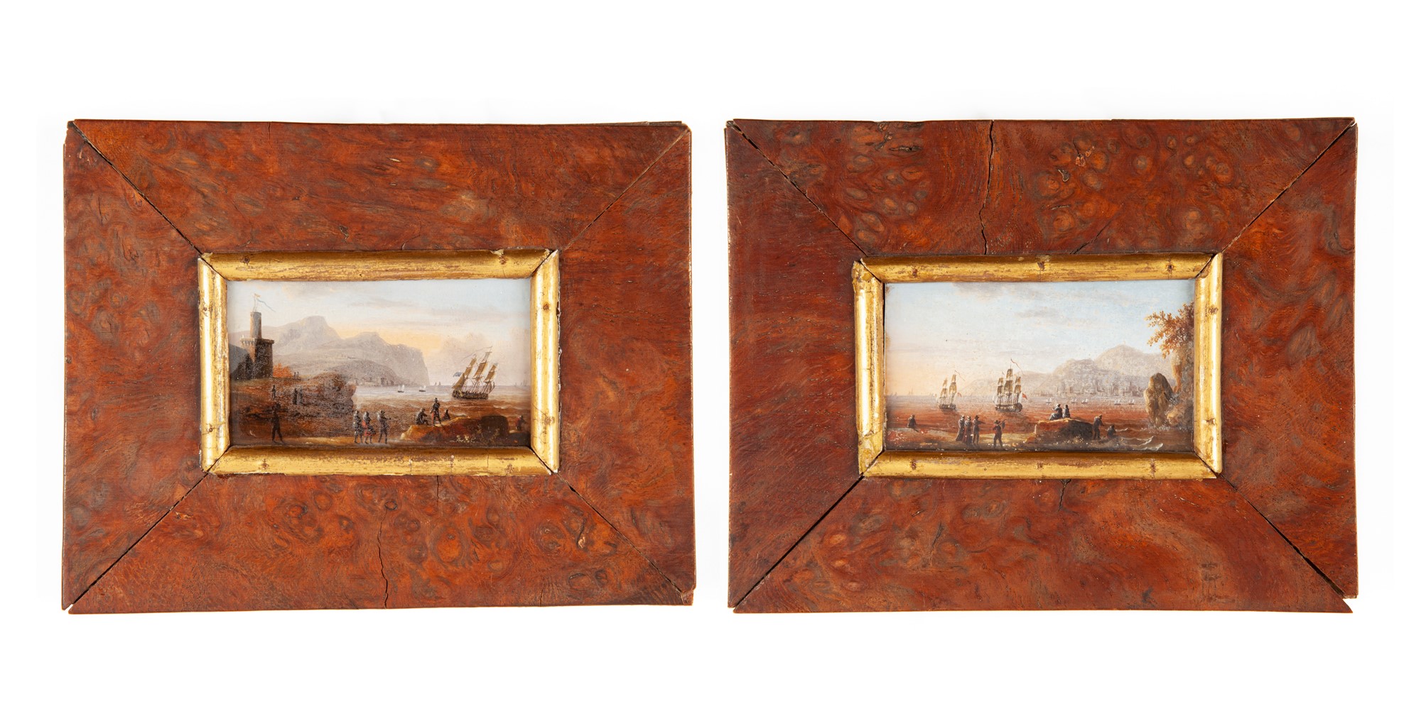 Pittore del XVIII secolo Coppia di dipinti in miniatura raffiguranti marine con velieri e personaggi