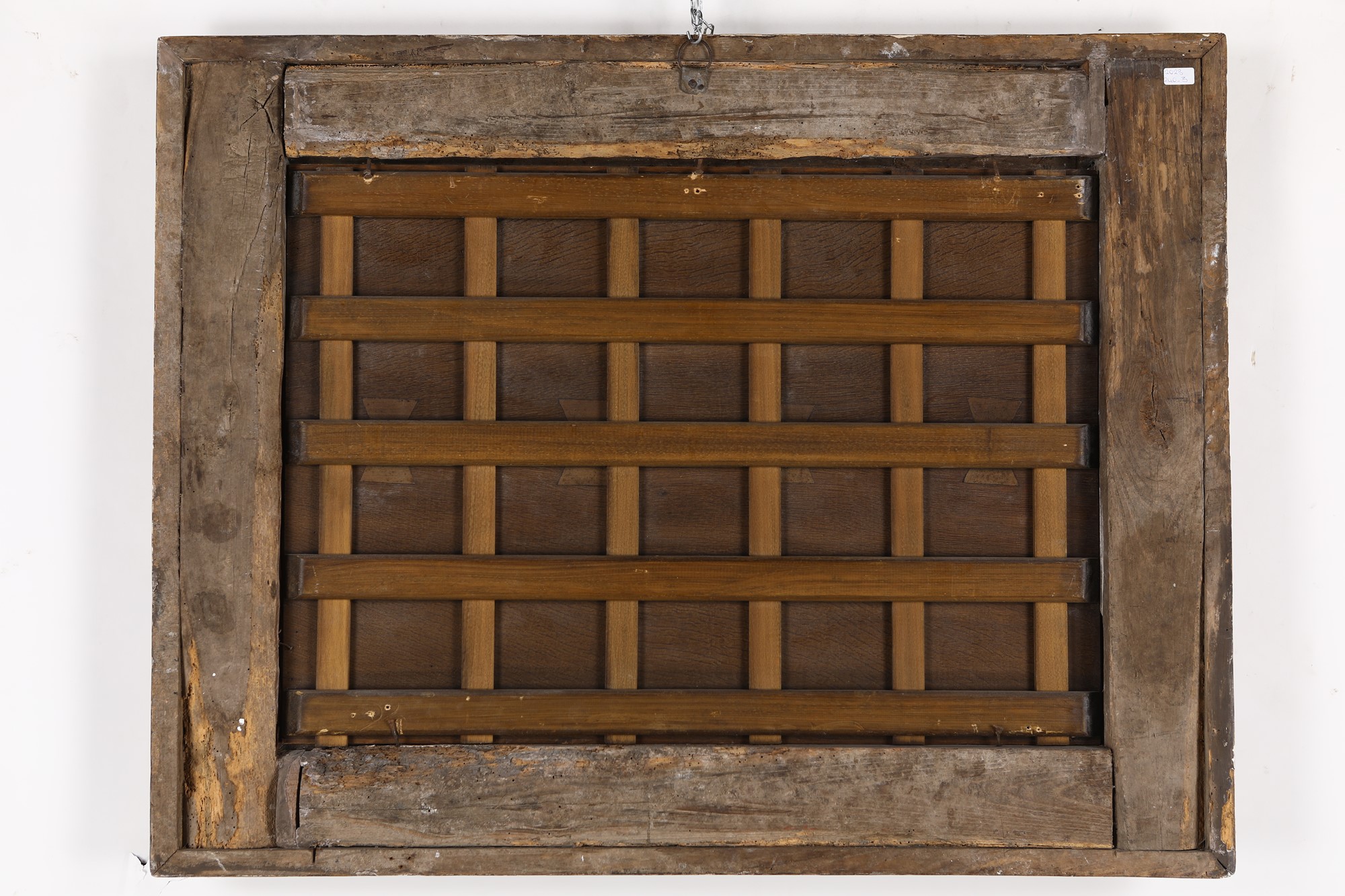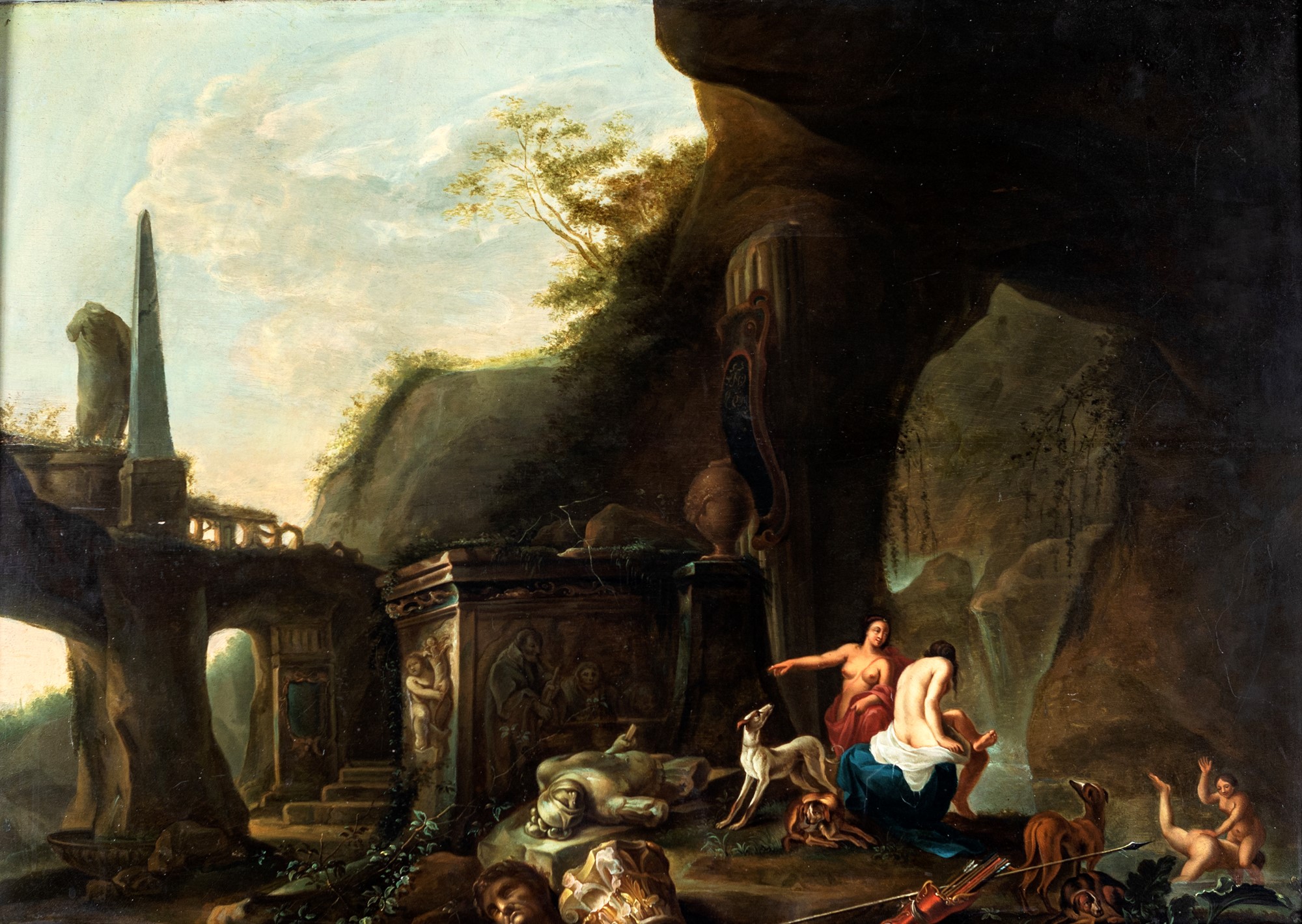Pittore francese, fine XVIII/inizio XIX secolo Paesaggio con caccia di Diana Il paesaggio si caratterizza per un pennellata fluida e sciolta che delinea le ninfe che giocano nell'acqua e si riposano dopo aver cacciato con la dea Diana e i cani. Di estremo interesse sono le varie statue, bassorilievi e obelischi di ascendenza classica presenti nel paesaggio, in particolare in primo piano troviamo una scultura di un giovane morente da identificare con Adone. Gli elementi stilistici, il tratto liquido e la chiarezza dei colori ci inducono a pensare ad un pittore francese attivo a Roma alla fine del XVIII secolo. olio su tavola cm 53x72 - in cornice cm 76x96