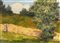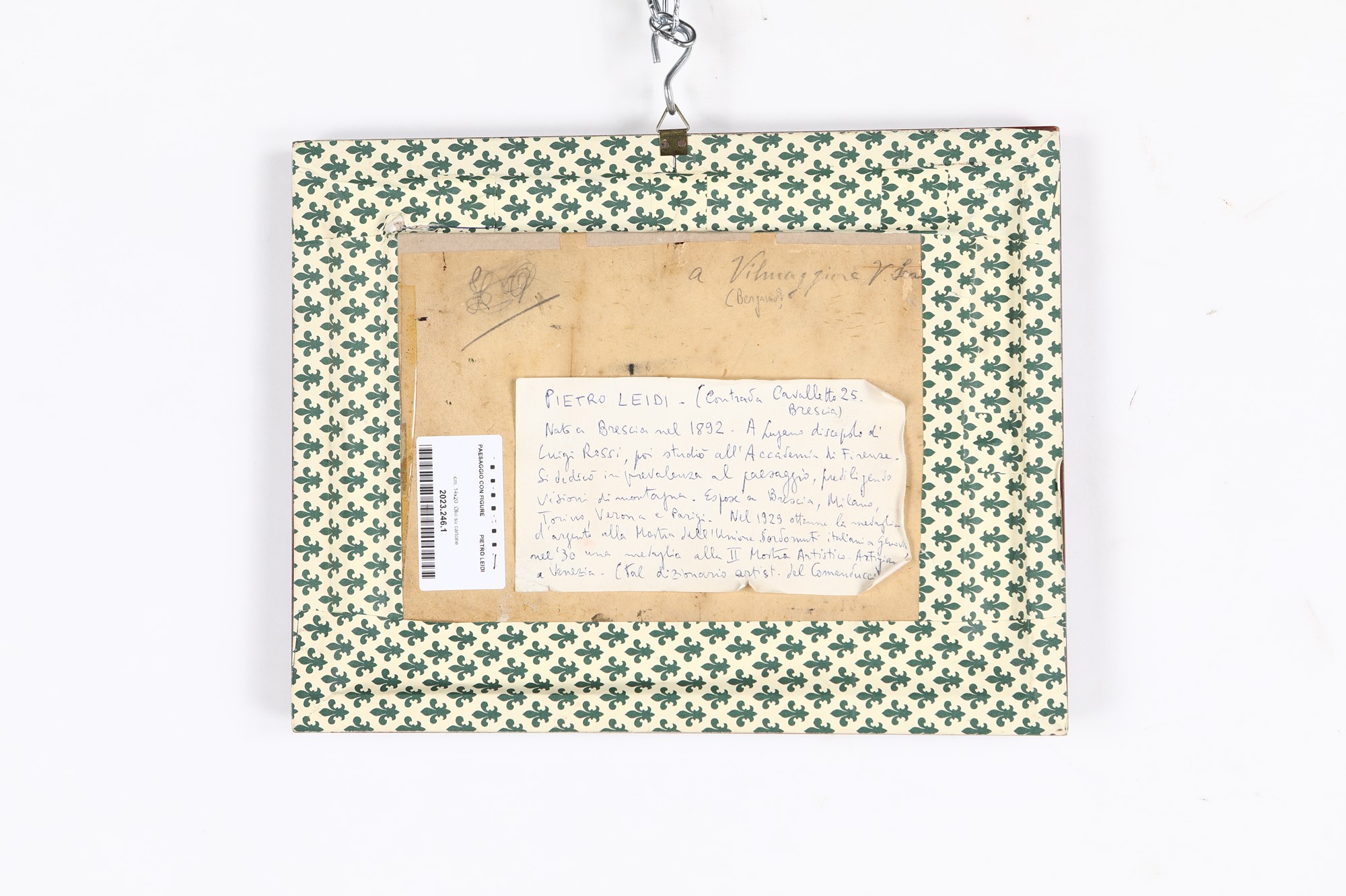 Pietro Leidi Brescia 1892-Brescia 1976 Paesaggio con figure a passeggio Firmato P. Leidi in basso a destra. Al verso etichetta manoscritta con informazioni sull'autore olio su cartone cm 14x20 - in cornice cm 22x28,5