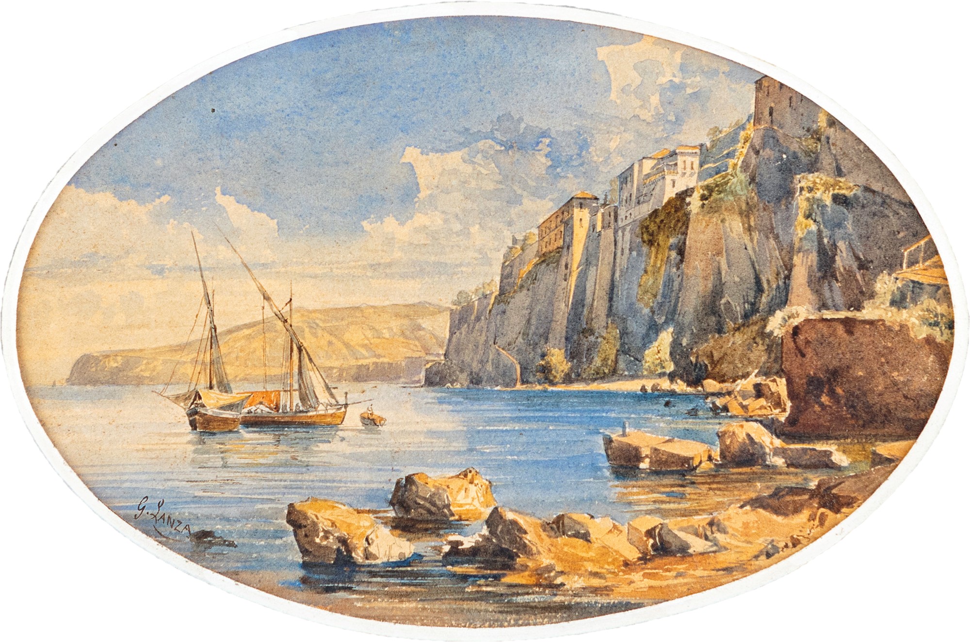 Giovanni Giordano Lanza Napoli 1827-Napoli 1898 Imbarcazione a Sorrento Firmato in basso a sinistra "G. Lanza" acquerelli su carta cm 13,5x20,5 - in cornice dorata cm 22x28,5