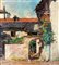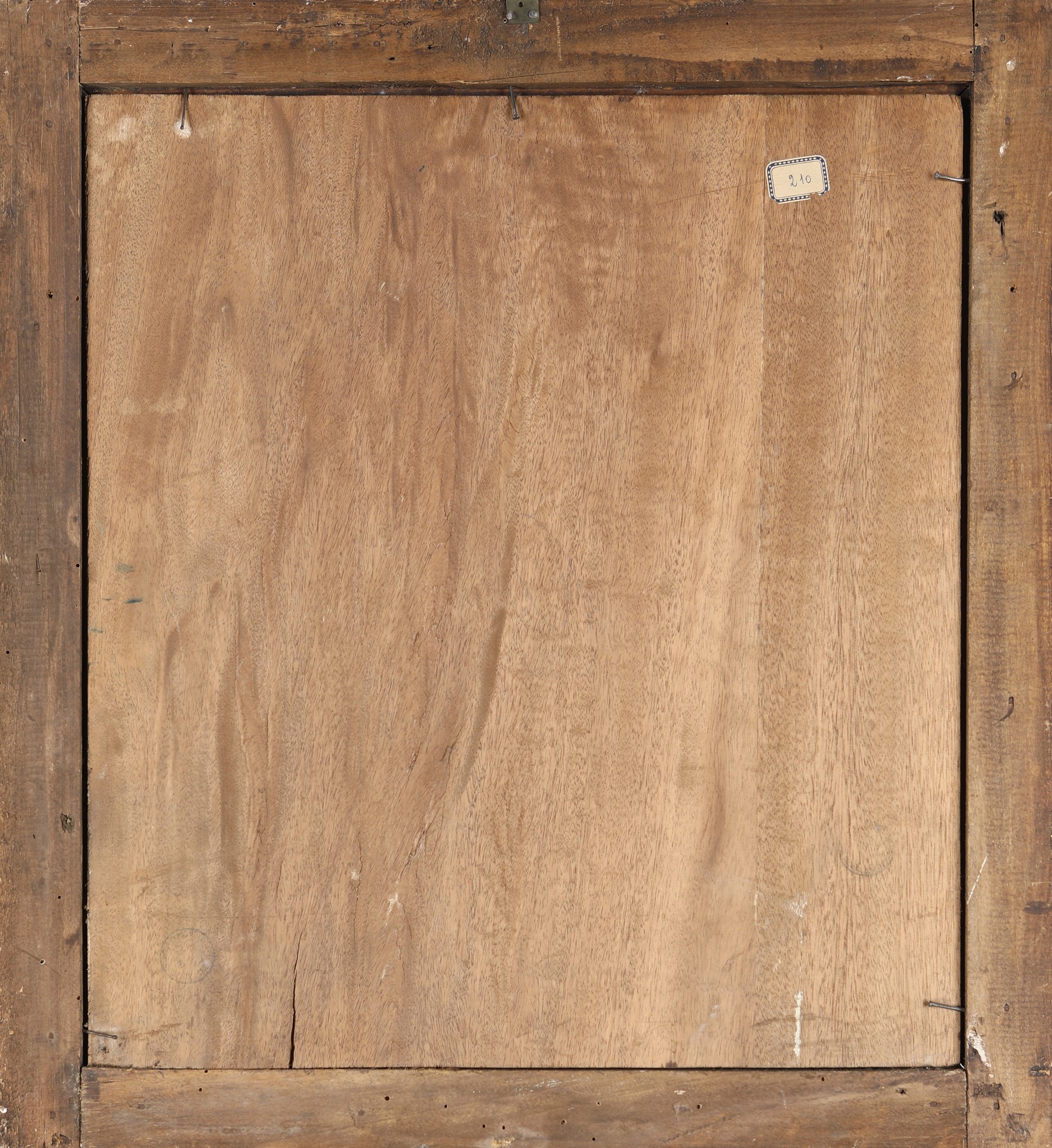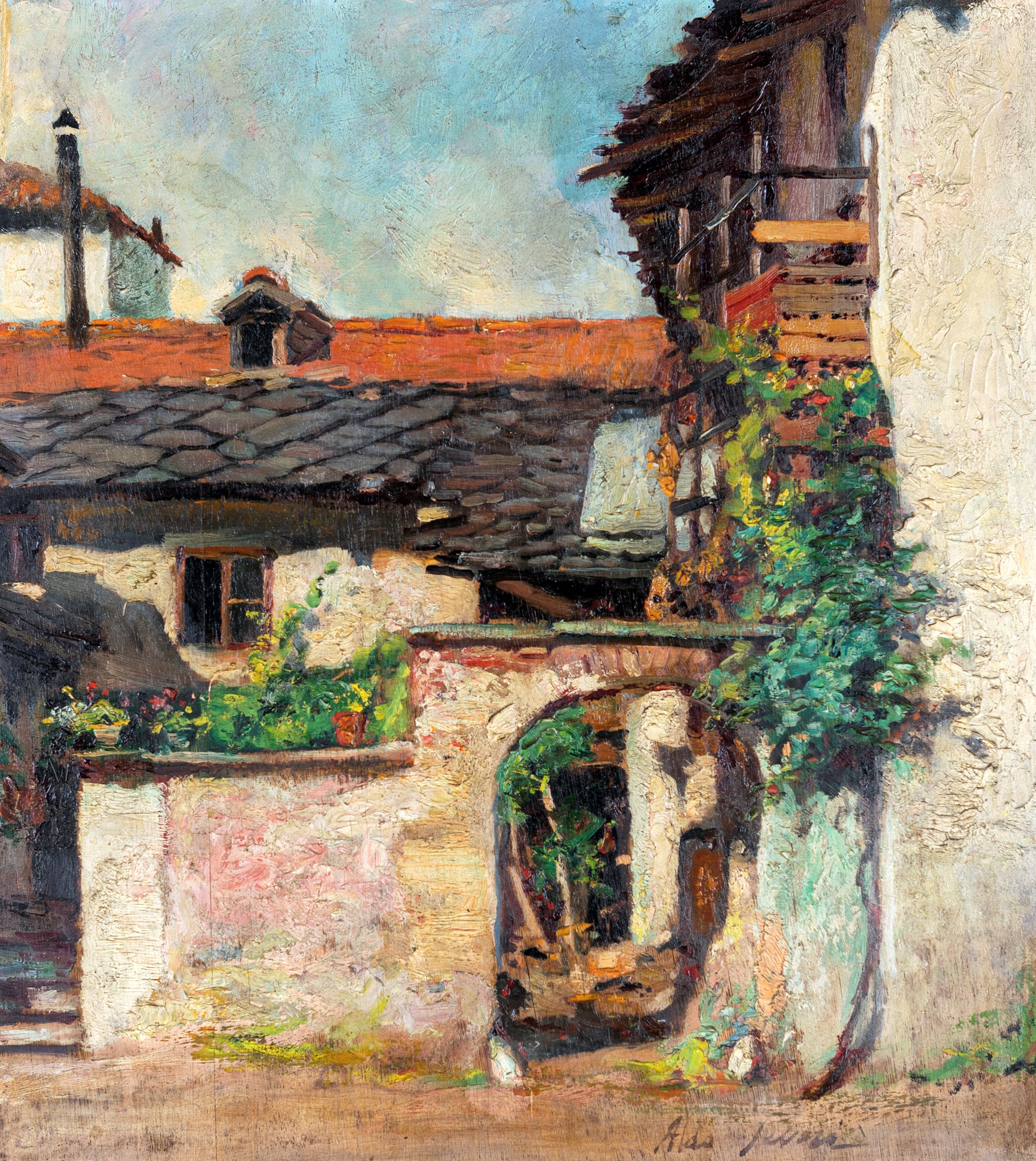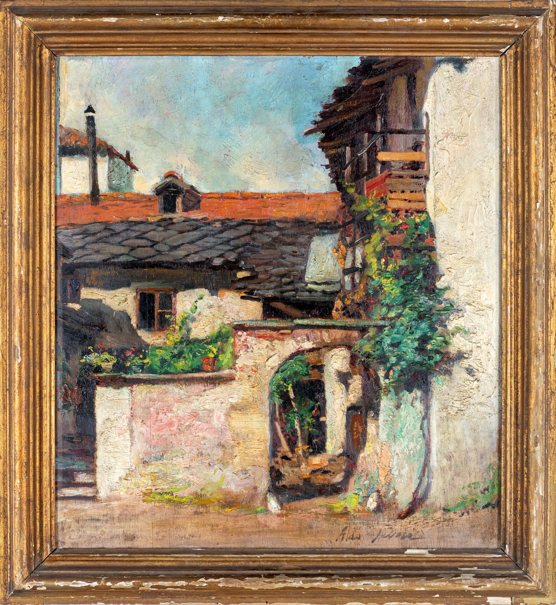 Aldo Severi Macerata 1876-Roma 1956 Scorcio piemontese Firmato in basso a destra "Aldo Severi". Al verso antica etichetta di esposizione o vendita e due timbri della Regia Dogana olio su tavola cm 45 x 50 in cornice dorata d'epoca cm 54,5 x 59