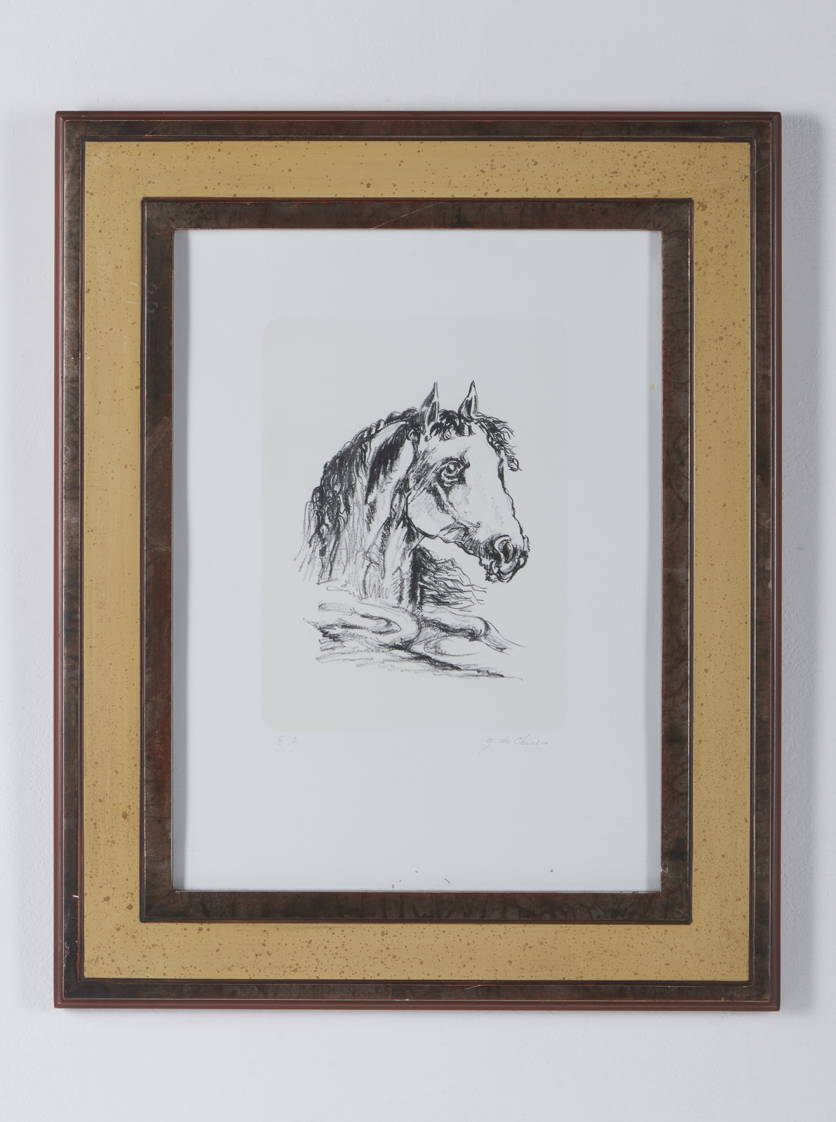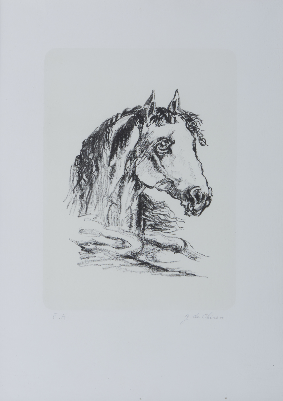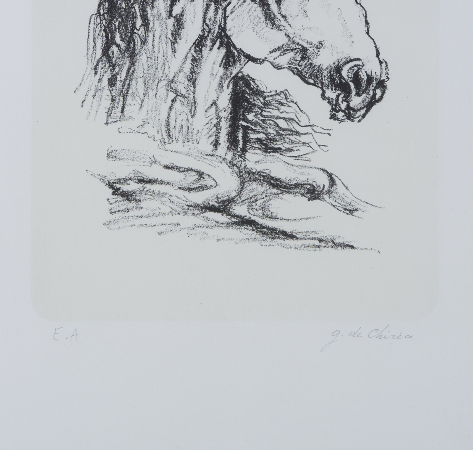 DE CHIRICO GIORGIO (1888 - 1978) Bucefalo. 1969. Litografia. Cm 30,00 x 40,00. E.a. Tiratura e firma in basso a matita. Edizione totale: 99 esemplari numerati da 1 a 99 + 25 esemplari numerati da I a XXV + 12 prove d'artista + 15 esemplari colorati a mano. Pubblicazione: Giorgio De Chirico, Catalogo dell'opera grafica 1969-1977, Edizioni Bora, p.96 n.78. Cornice presente