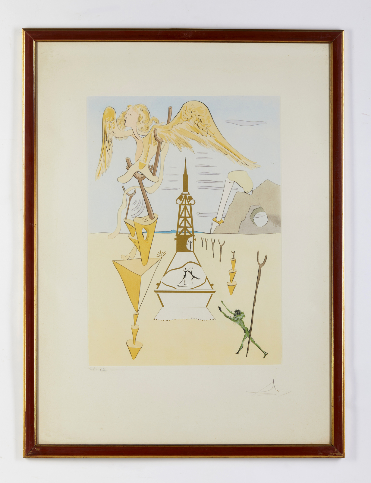 DALI' SALVADOR (1904 - 1989) Dalla cartella: Hommage à Leonardo da Vinci (Great American Inventions). 1975. Acquaforte e acquatinta. Cm 55,50 x 75,50. E.A.5/60. Tiratura e firma in basso a matita. Dimensioni lastra:50x36.5 cm. Foglio proveniente dalla cartella Hommage à Leonardo da Vinci. Edizione totale: 450 esemplari +60 ea, Stampato da Ateliers Rigal, Parigi. Pubblicato da Transworld Art, New York. Pubblicazione: Michler/Löpsinger 808-819; Field 75-8. (Cartella non completa). Cornice presente