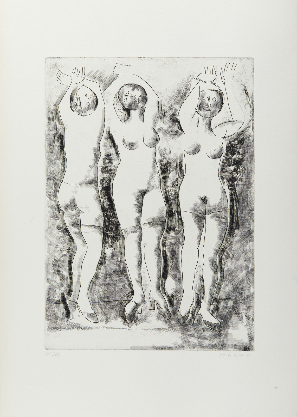 MARINI MARINO (1901 - 1980) Tre Danze. 1968. Acquaforte. Cm 50,00 x 70,00. 30/60. Tiratura e firma in basso a matita. Timbro a secco Luigi de Tullio stampatore in basso a sinistra. L'opera fa parte della cartella "Marino Marini opera grafica, incisori italiani contemporanei", contenente 20 acqueforti e puntesecche incise dal 1959 al 1971, Luigi De Tullio Editore. Le incisioni sono impresse su Vélin Cuve BFK Rives Velin D'Arches e carta Tino Magnani. Edizione totale: 60 esemplari numerati da 1 a 60, 20 esemplari numerati da I a XX, 5 esemplari fuori commercio contrassegnati dalle lettere A, B, C, D, E. Dimensione lastra: 48.5x35 cm. Pubblicazioni: Catalogo ragionato dell'Opera grafica (Incisioni e Litografie) 1919-1980, a cura di Guido Guastalla, Giorgio Guastalla, Marino Marini, Edizioni Graphis Arte, Livorno, 1990, pp. 67, 209, n. A89.