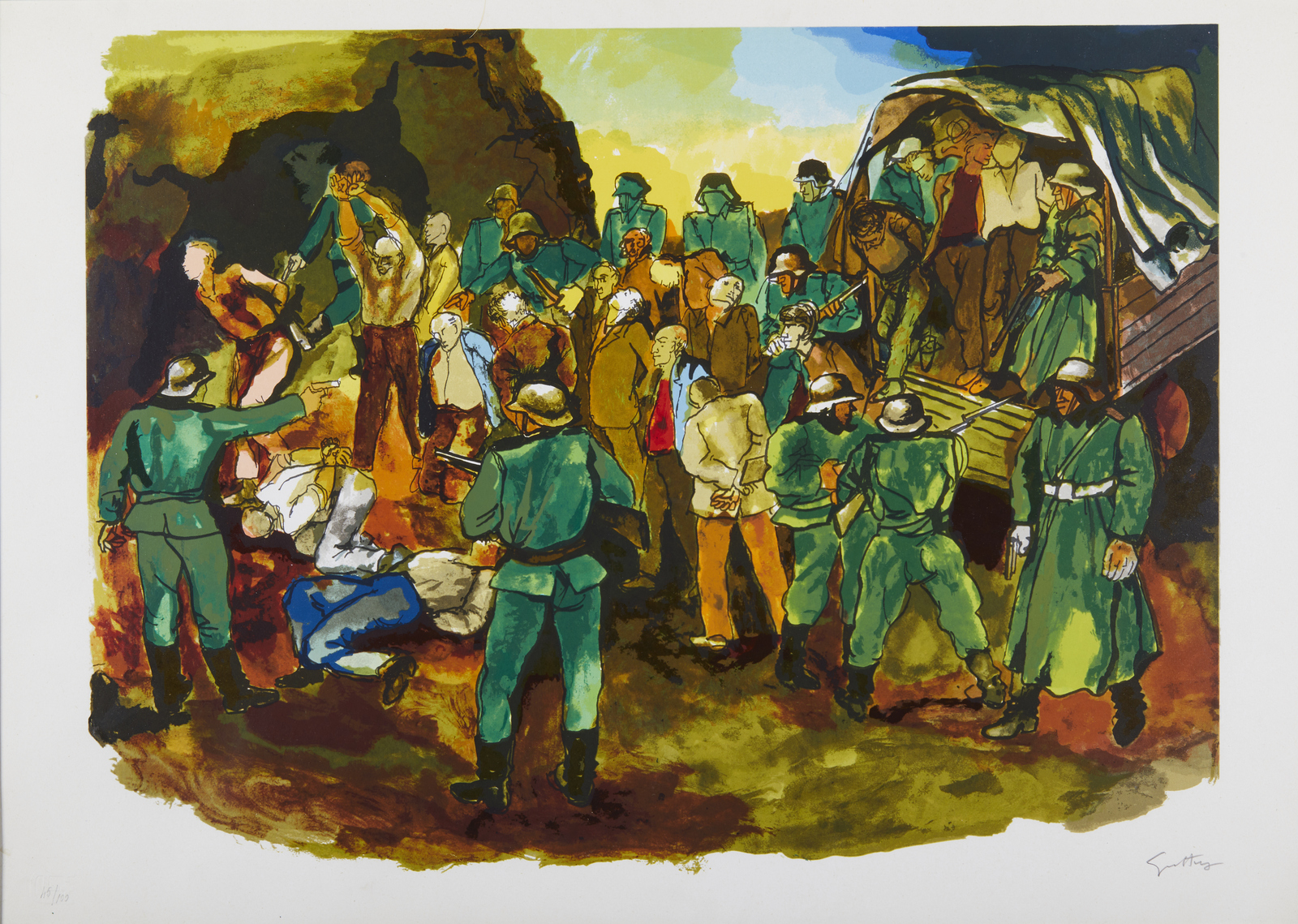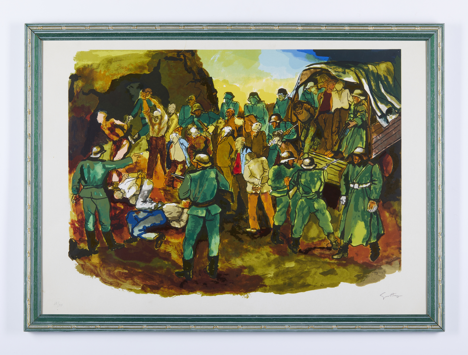GUTTUSO RENATO (1912 - 1987) Dalla cartella Gott Mit Uns. . 1981. Serigrafia. Cm 70,00 x 50,00. 45/100, Tiratura e firma in basso a matita. Timbro a secco Esperienza Grafica in basso a sinistra. Edizione totale: 100 esemplari in numeri arabi + 11 prove d’artista + 1 prova d’archivio. Lievi difetti. Cornice presente