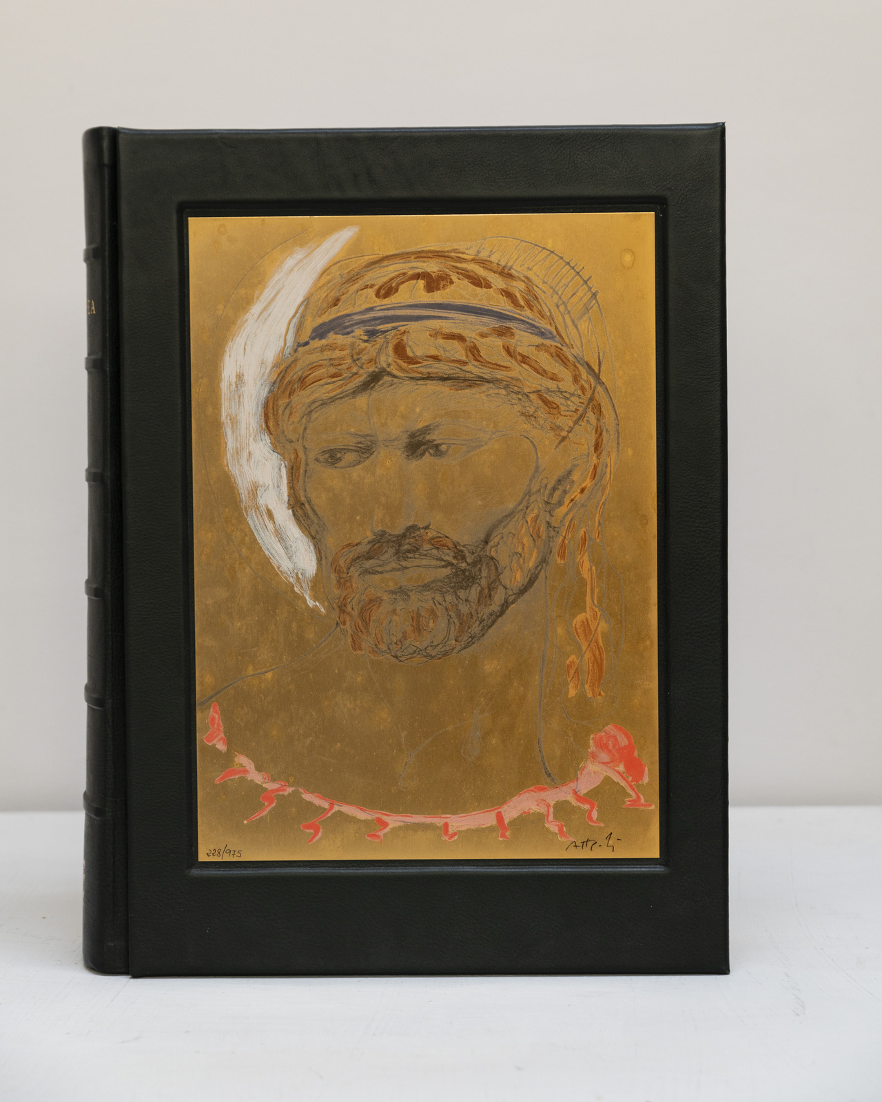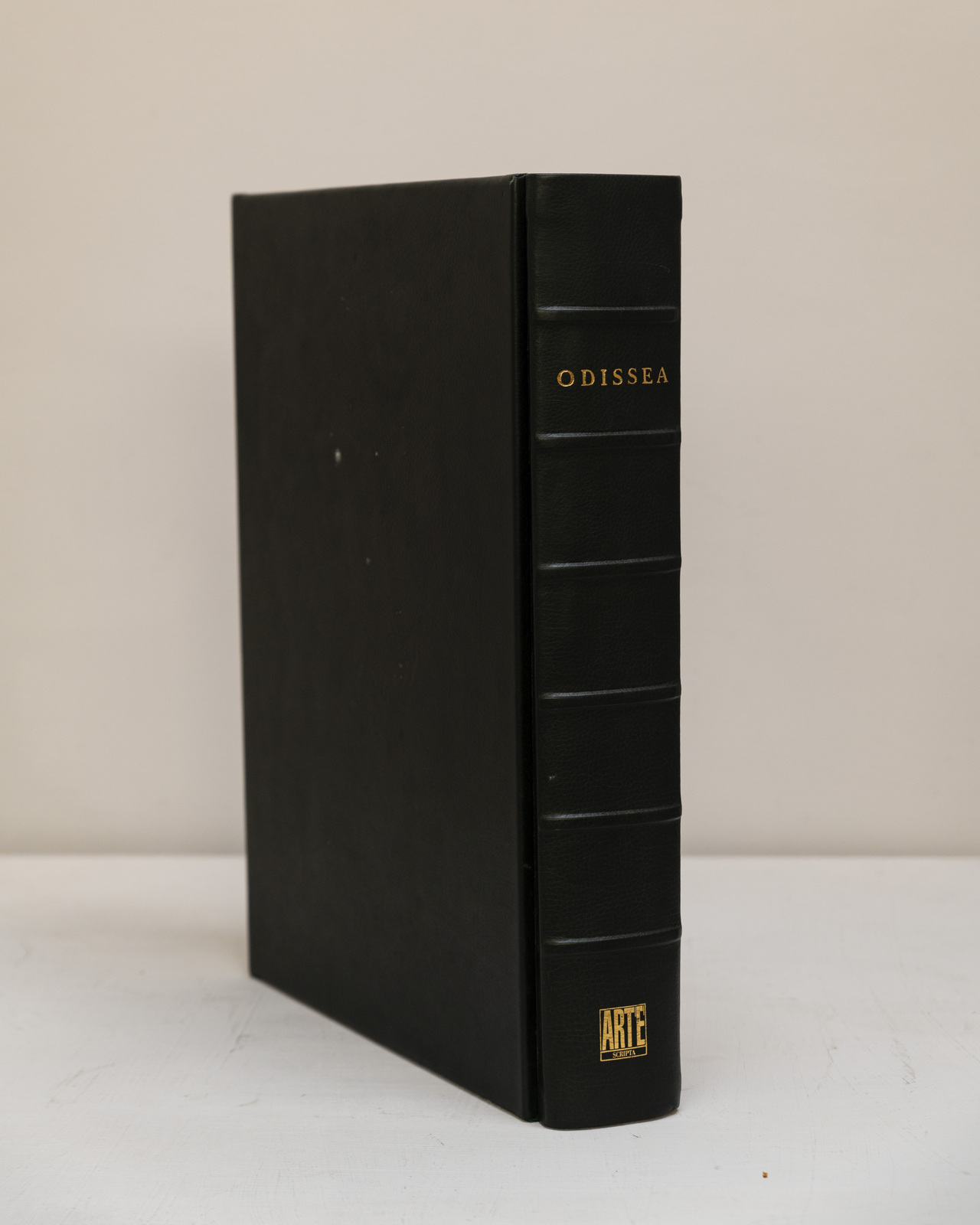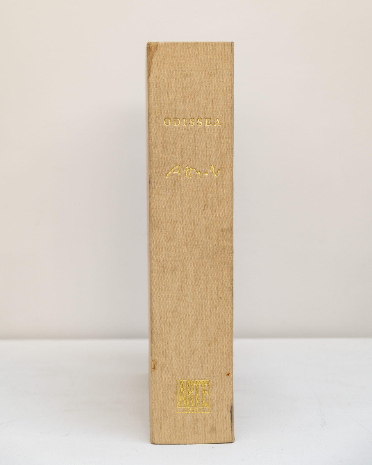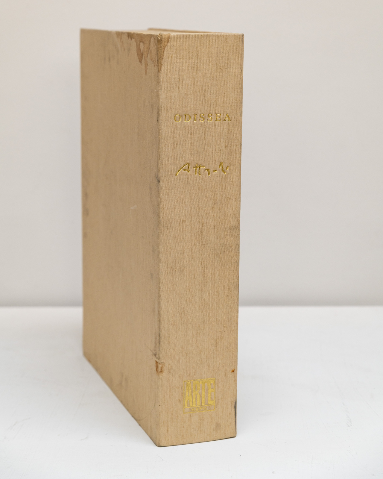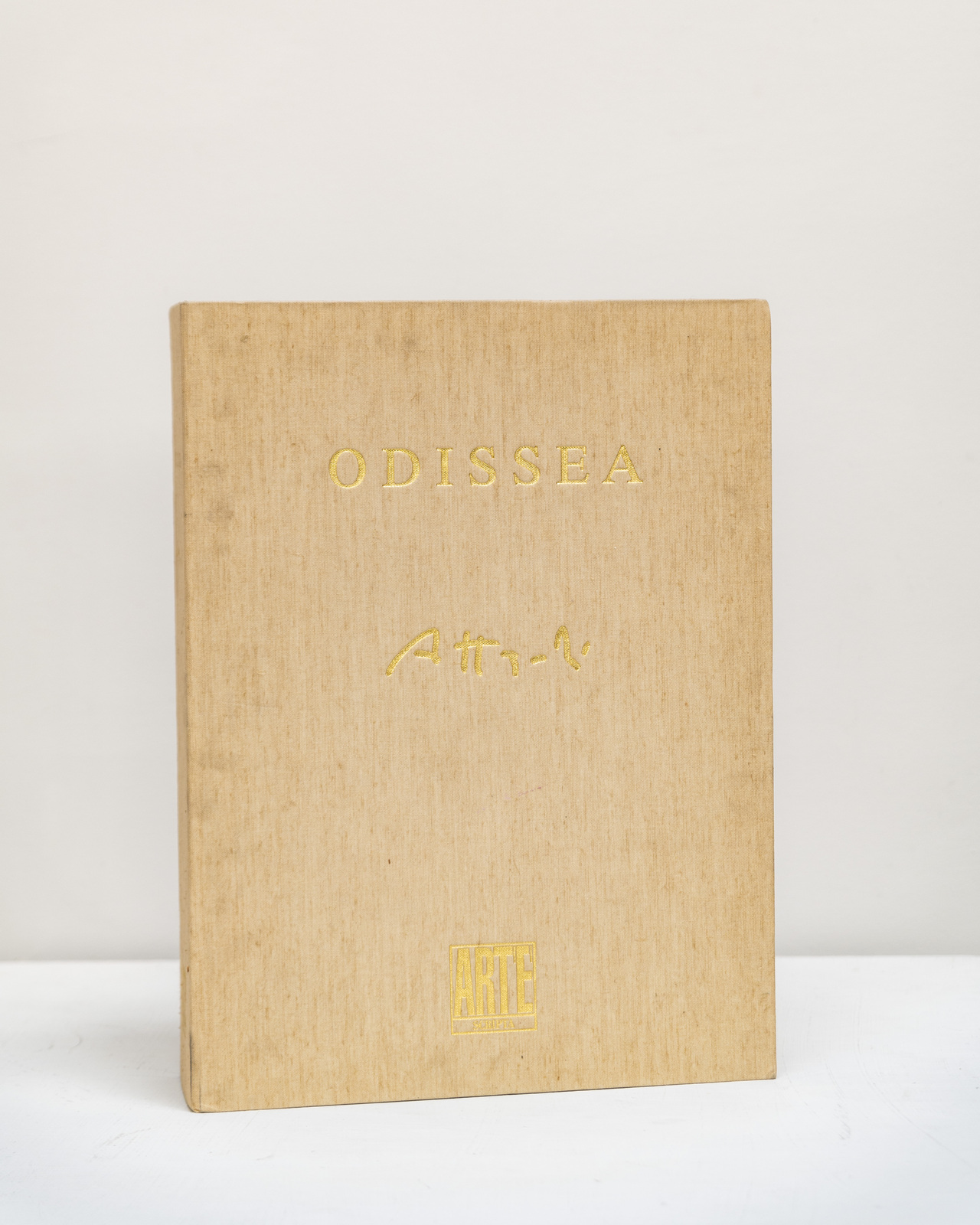 ATTARDI UGO (1923 - 2006) Omero. Odissea. 2000. Libro d'arte. Cm 38,00 x 50,00 x 11,00. 228/975. Tiratura e firma in basso sulla copertina. Tiratura e firma nel colophon. Libro d'artista composto da 14 tavole a colori fuori testo testo e 27 illustrazioni in bianco e nero nel testo. In copertina: Il volto di Ulisse, Ugo Attardi, serigrafia su lastra di acciaio bagnato in oro. Stamperia: Monotipia Olivieri, Milano. Carta BFK Rives delle cartiere d'Arches. Le 14 tavole fuori testo sono state stampate su carta BFK Rives presso la Stamperia d'Arte Arte 3, Milano. Edizione totale: 975+LXXV esemplari. Confezione originale. Editore: FMR-Art'é, Bologna. Dimensioni libro: 46x34.5x9 cm. Dimensioni libro aperto: 46.5x74 cm. Lievi difetti.