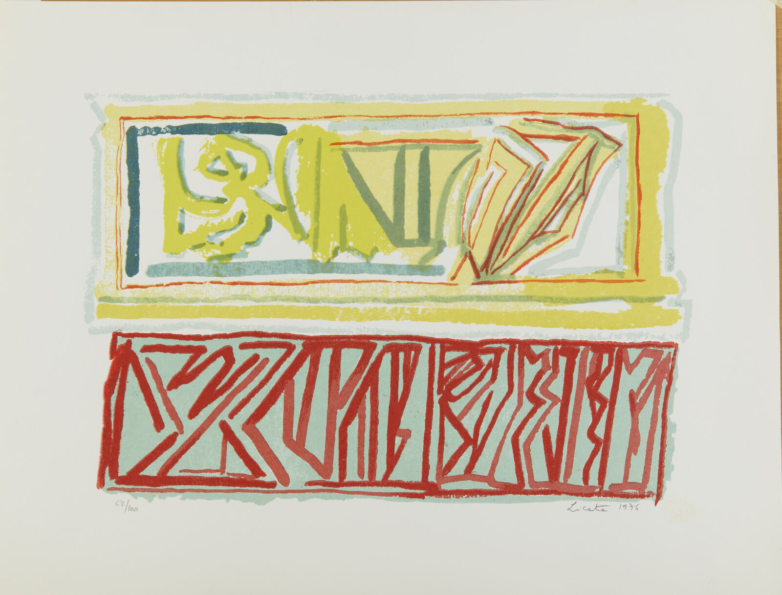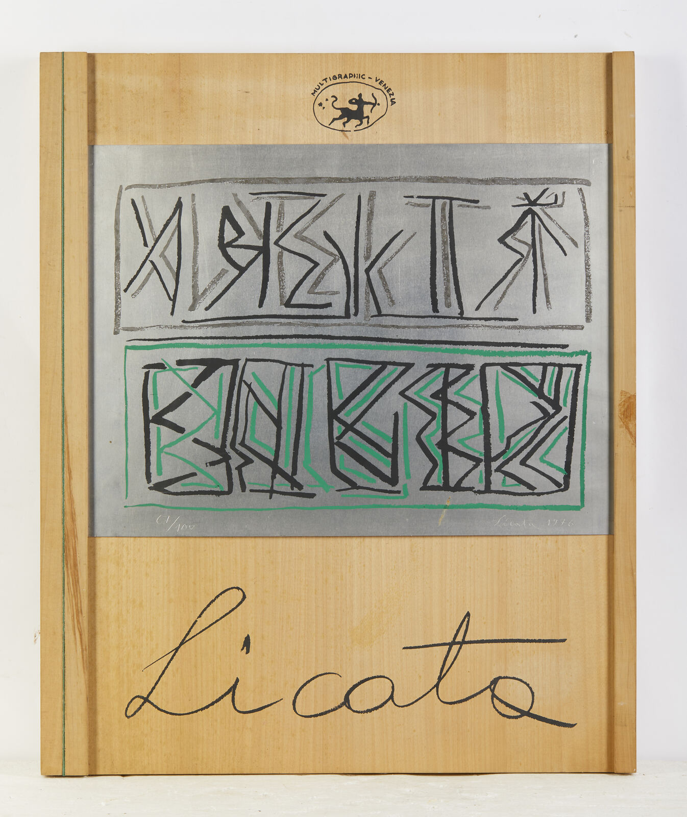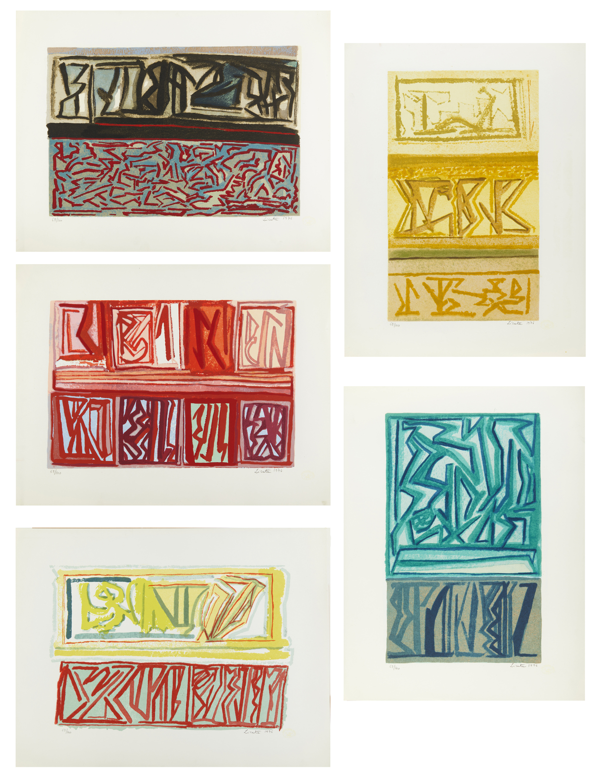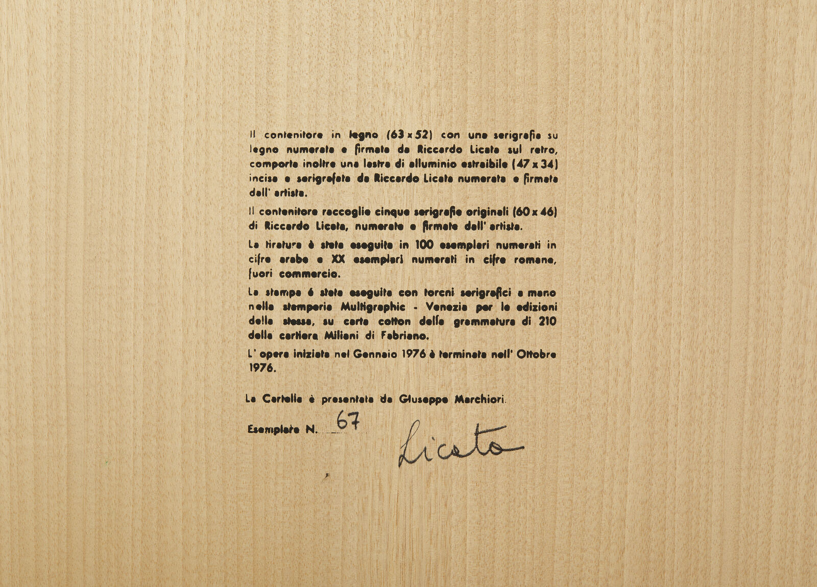 LICATA RICCARDO (1929 - 2014) Senza titolo. 1976. Serigrafia (cartella completa). Cm 46,00 x 60,00. 67/100. Cartella completa composta da n. 5 serigrafie. Ogni foglio è firmato e numerato a matita. Edizione totale: 100 esemplari numerati da 1 a 100 + XX esemplari numerati da I a XX fuori commercio. Editore e stampatore: Multigraphic, Venezia. Carta Miliani di Fabriano. Scatola in legno presente riportante la serigrafia su alluminio.