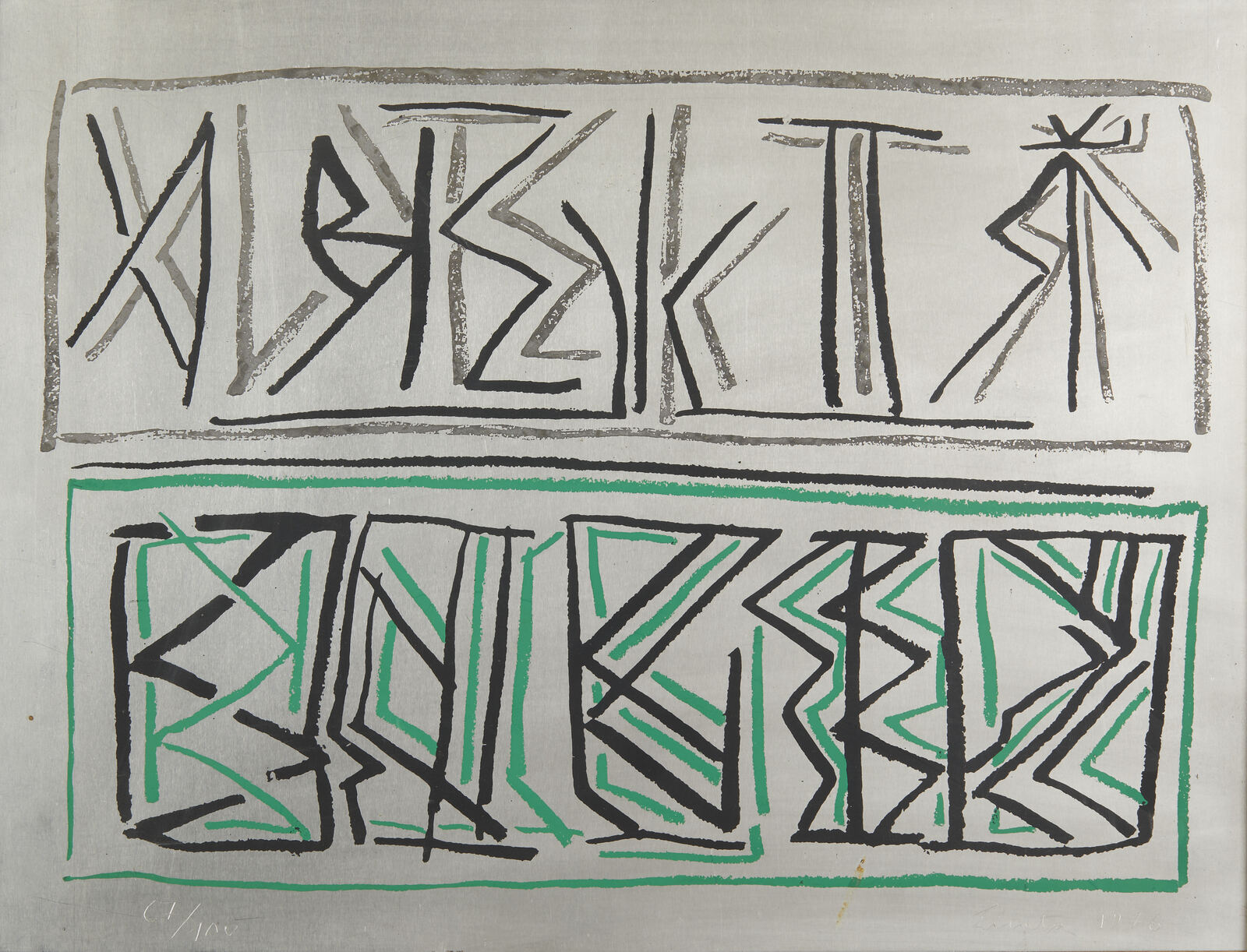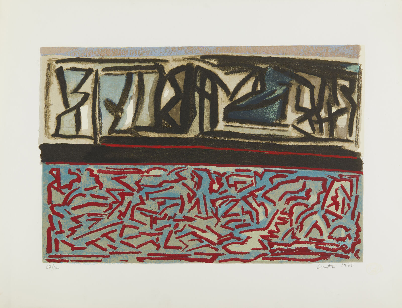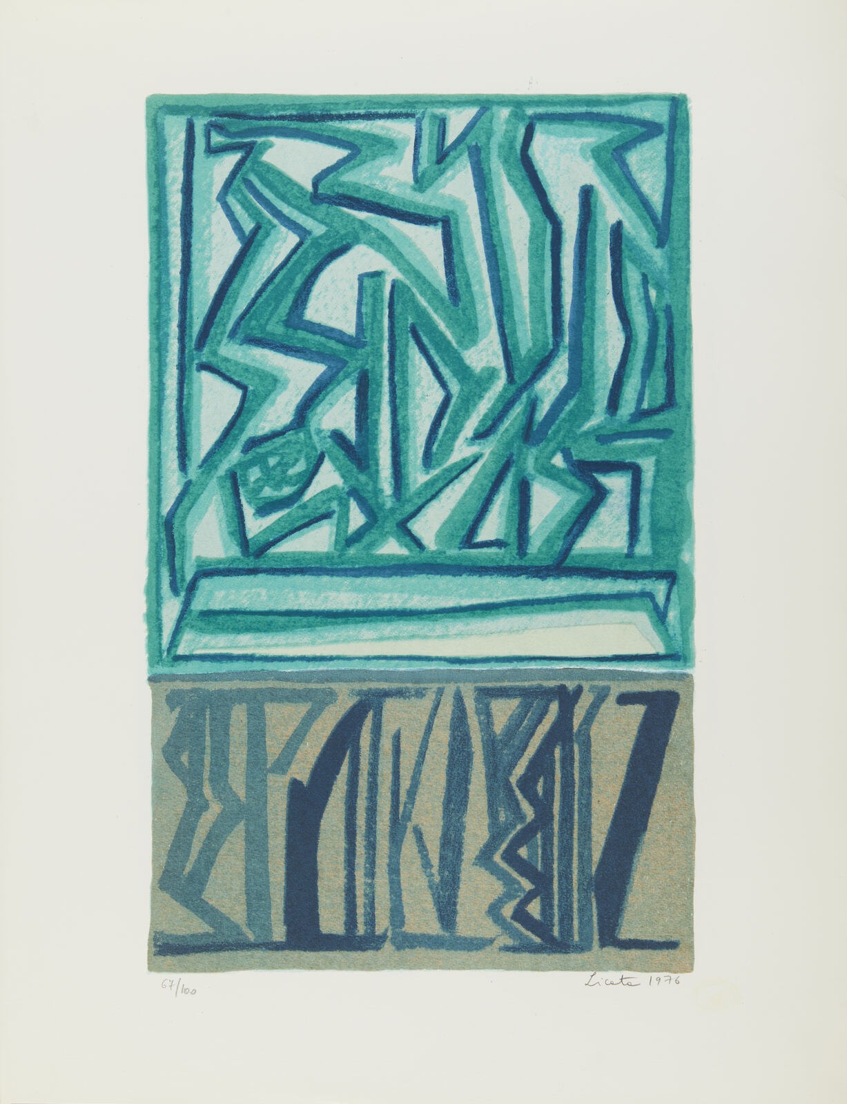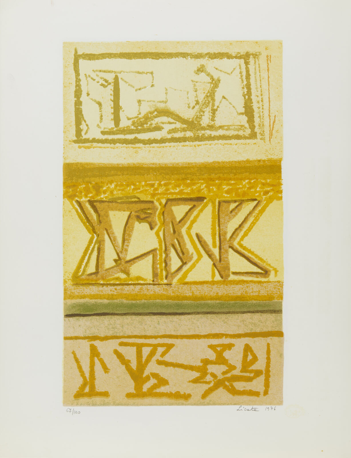 LICATA RICCARDO (1929 - 2014) Senza titolo. 1976. Serigrafia (cartella completa). Cm 46,00 x 60,00. 67/100. Cartella completa composta da n. 5 serigrafie. Ogni foglio è firmato e numerato a matita. Edizione totale: 100 esemplari numerati da 1 a 100 + XX esemplari numerati da I a XX fuori commercio. Editore e stampatore: Multigraphic, Venezia. Carta Miliani di Fabriano. Scatola in legno presente riportante la serigrafia su alluminio.