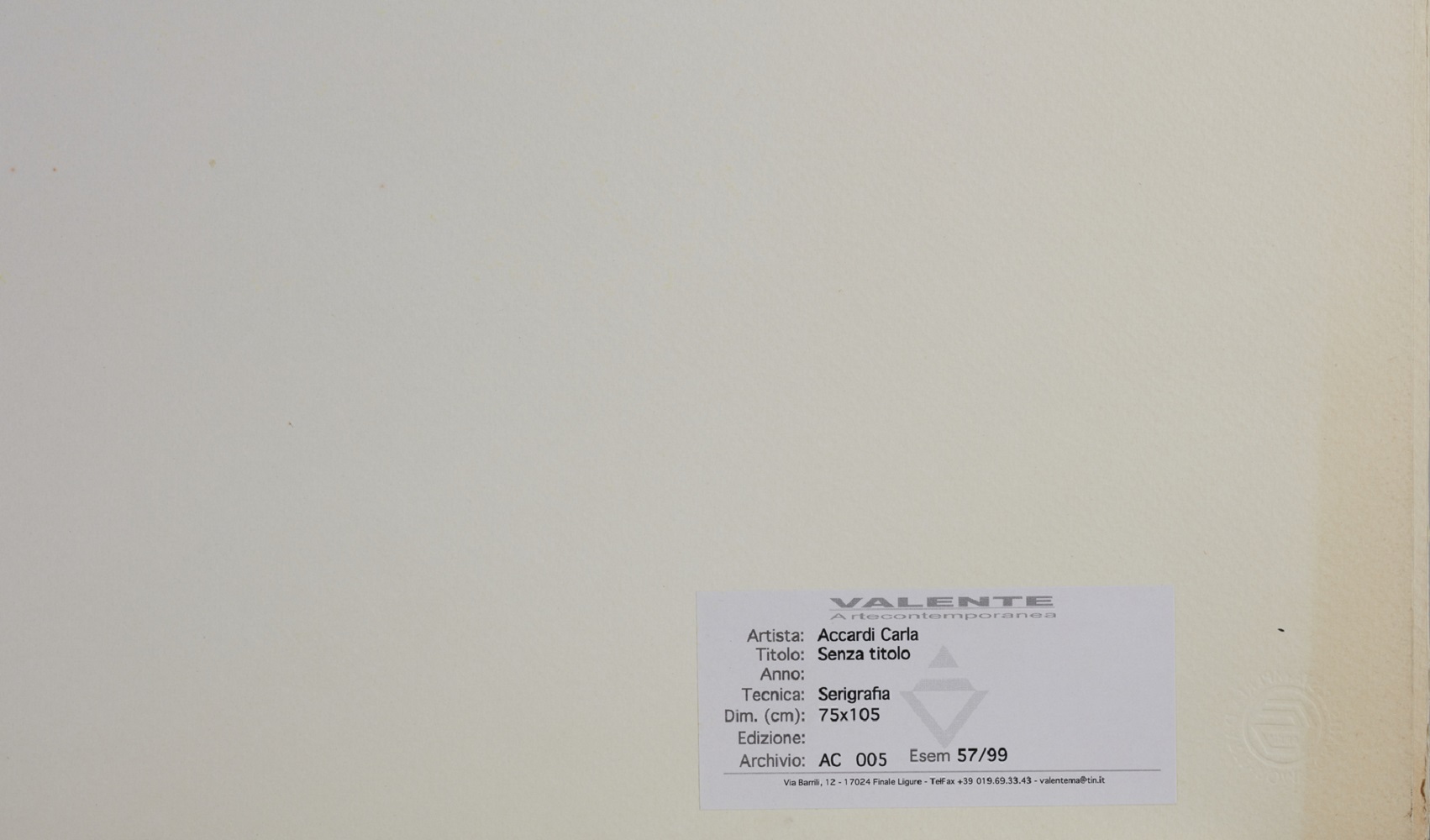 ACCARDI CARLA (1924 - 2014) Senza titolo. Serigrafia. Cm 105,00 x 75,00. 57/99. Tiratura e firma in basso a matita. Dimensioni lastra: cm 51x76. Timbro a secco - Stamperie Carafiser, Roma - in basso a sinistra. Lievi difetti.
