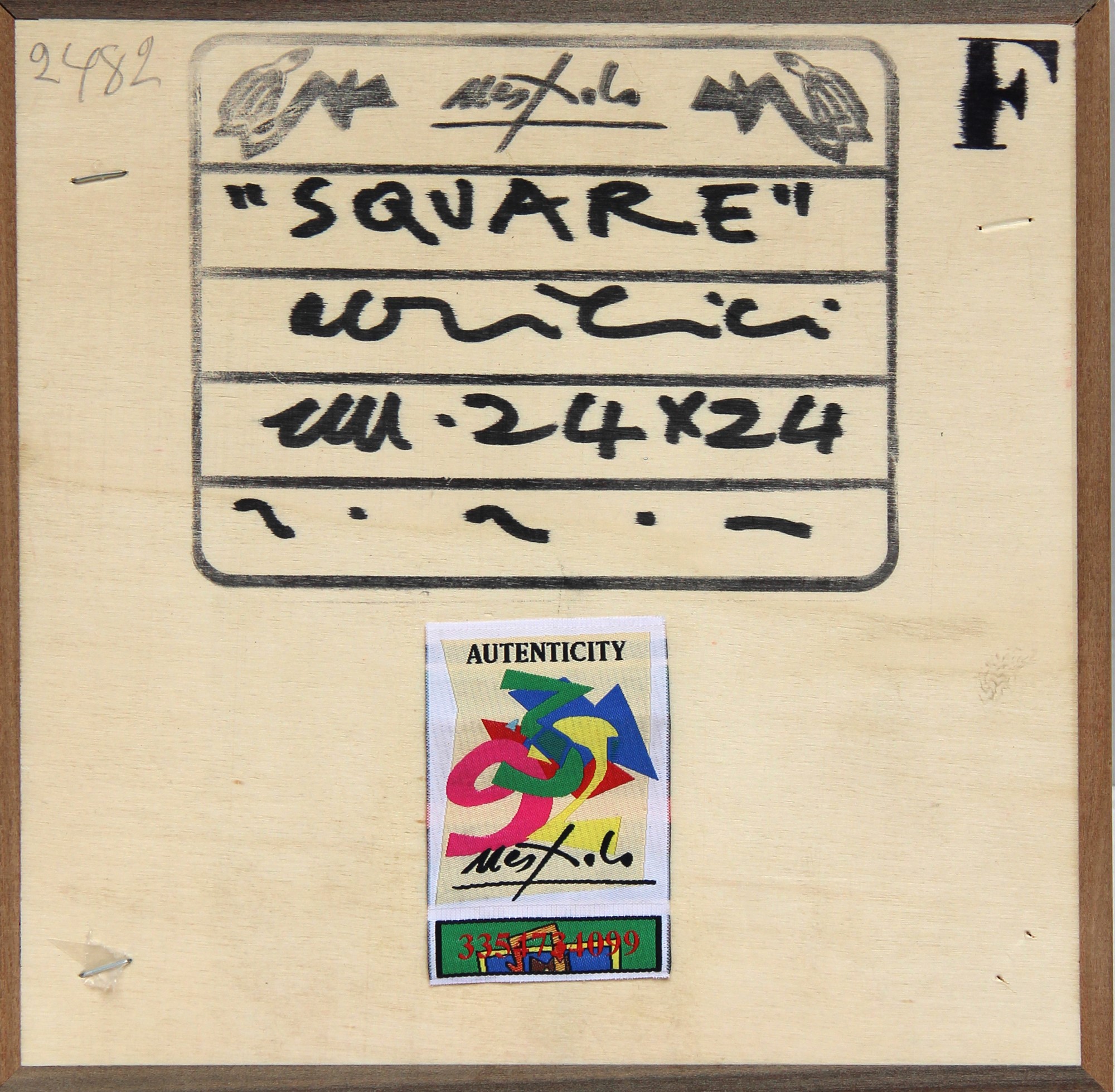 Titolo, tecnica, misura, firma "Square, acrilici, cm 24x24, Nespolo";