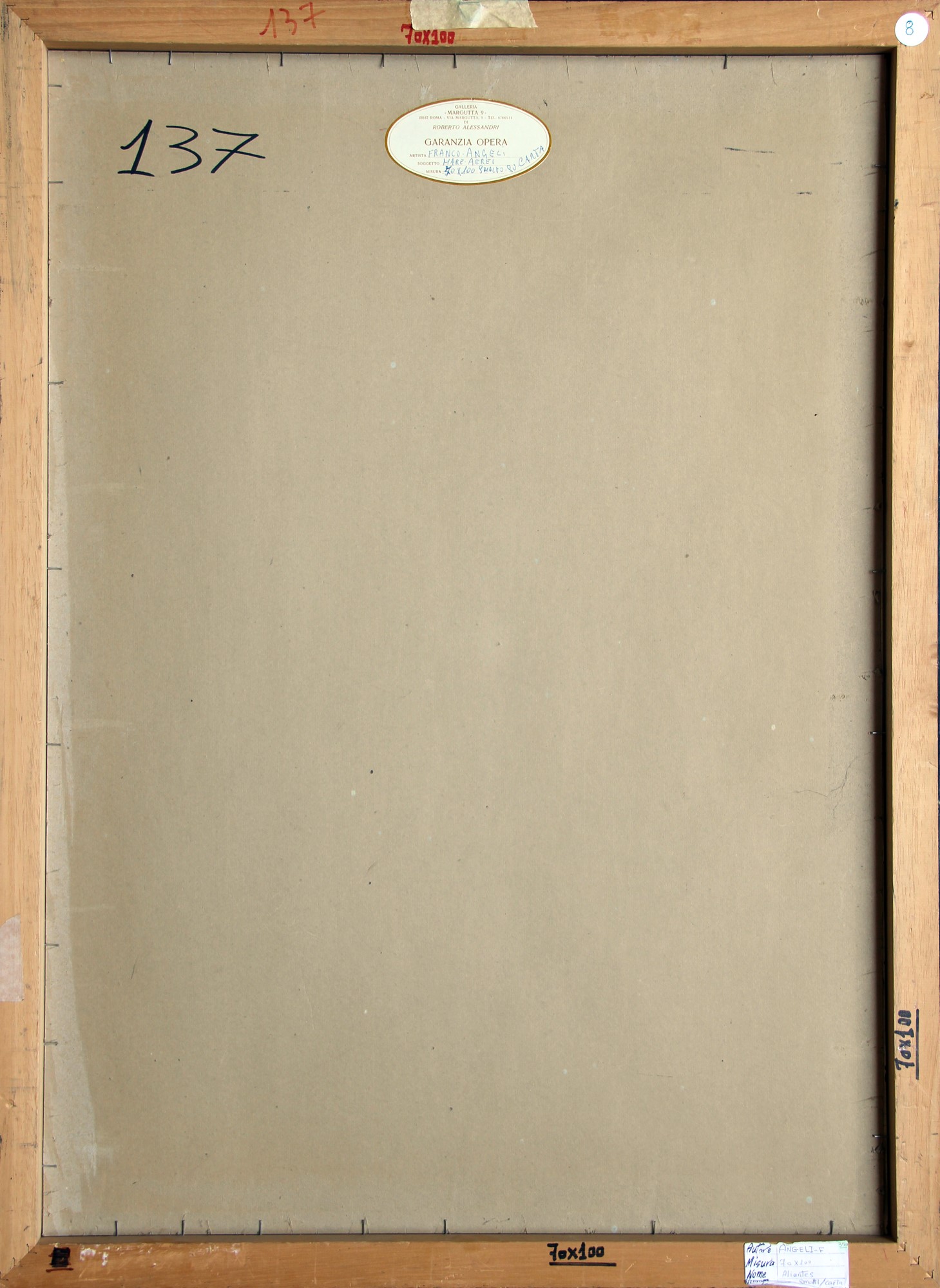 Autentica a cura dell'Archivio per la monografia "Franco Angeli 10 mercanti un artista", con firma di Angelino Calestani, con n. C. P. 417