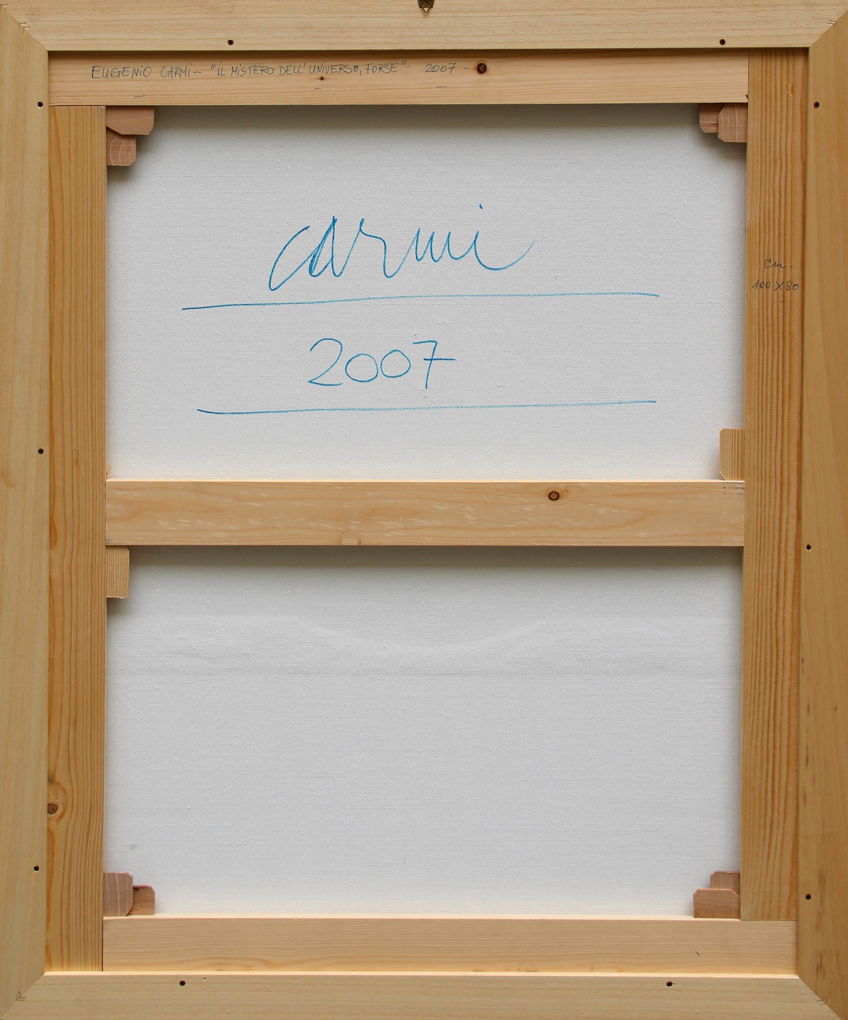 Firma, titolo, data, firma, data "Eugenio Carmi, Il mistero dell'universo, forse, 2007, Carmi, 2007" (al retro)
