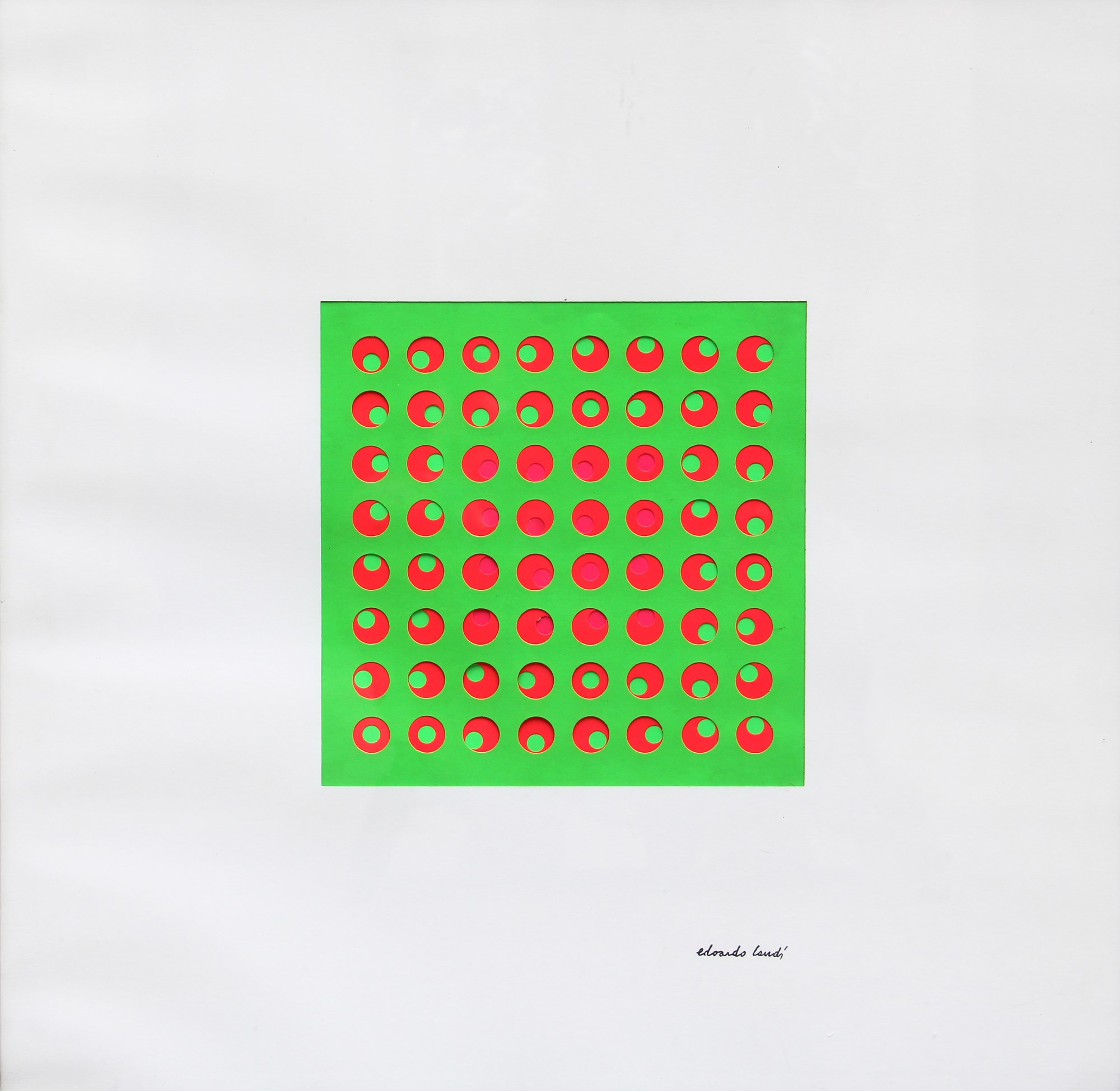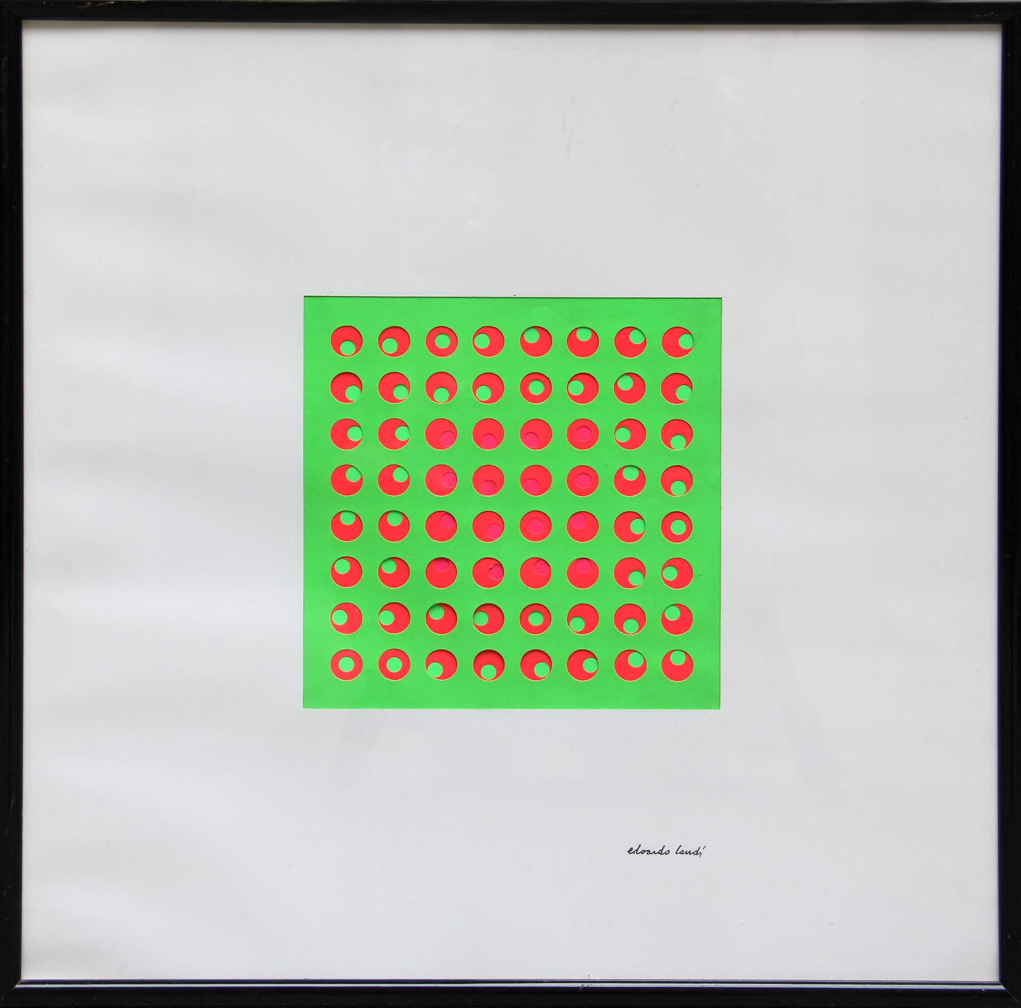 Edoardo LANDI, Senza titolo, anni 70, cartoncini colorati fustellati applicati su cartone, cm 50x50