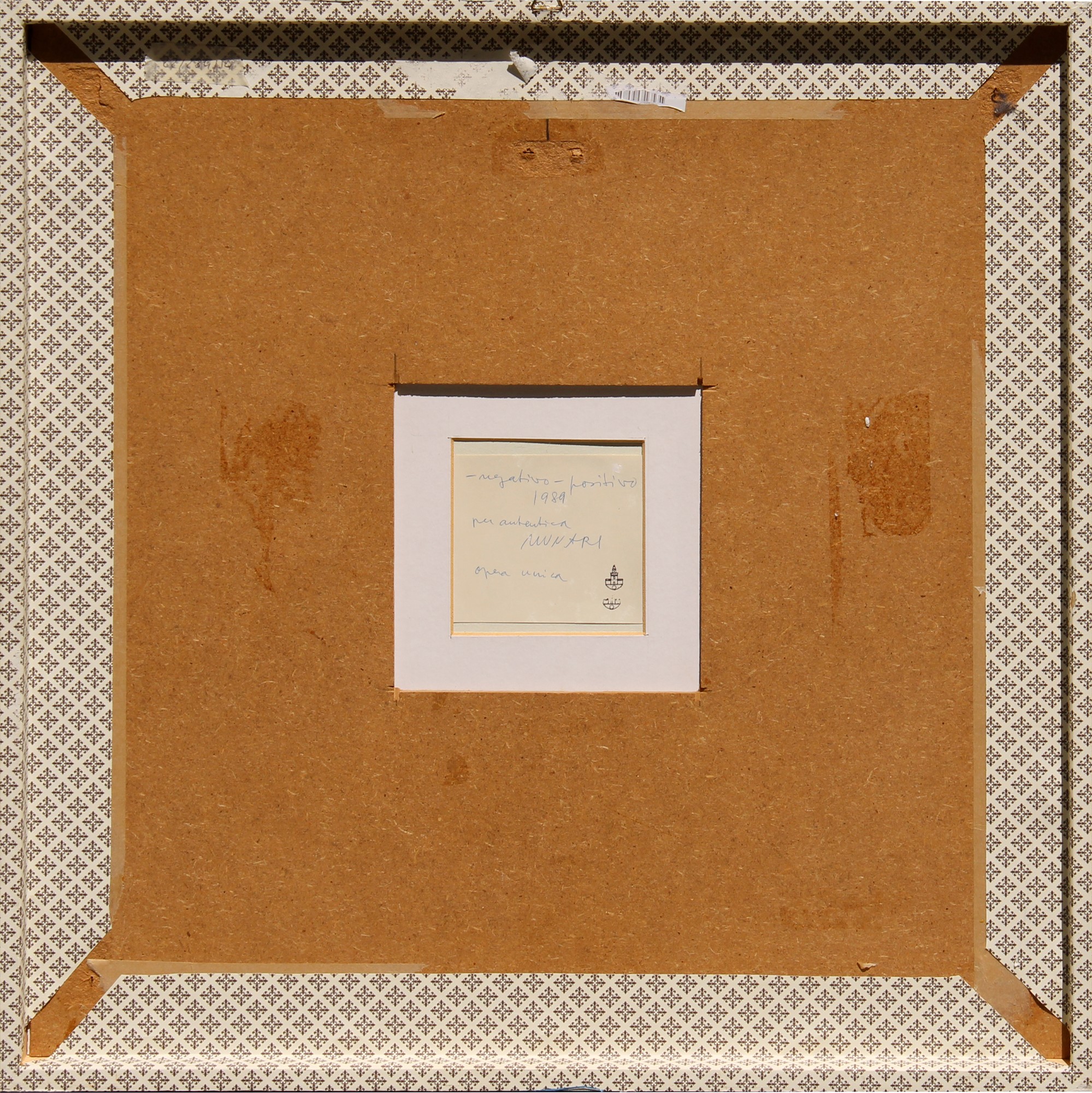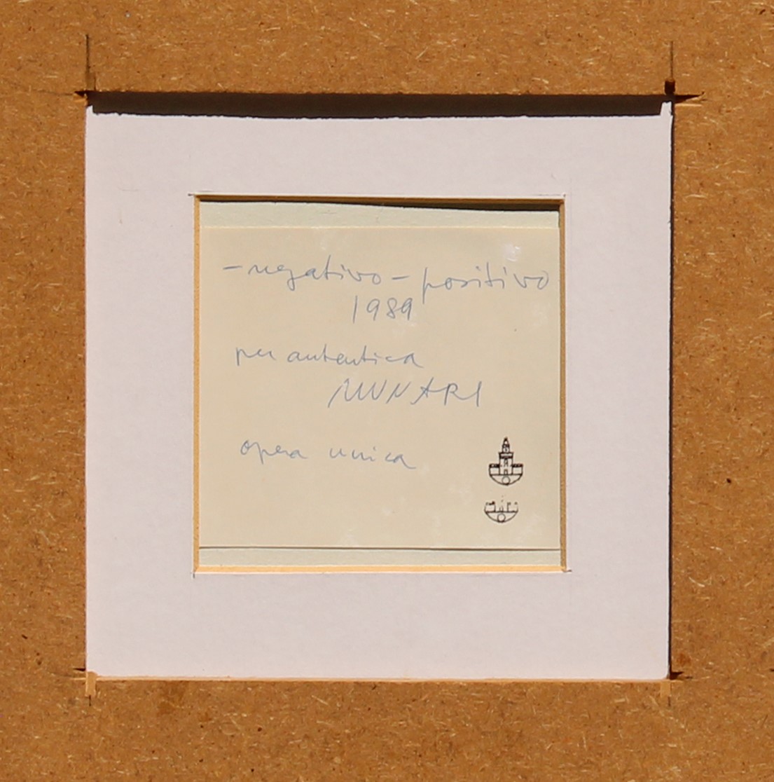 Titolo, data, dichiarazione di autenticità "Negativo-positivo, 1989, per autentica Munari opera unica" (al retro)