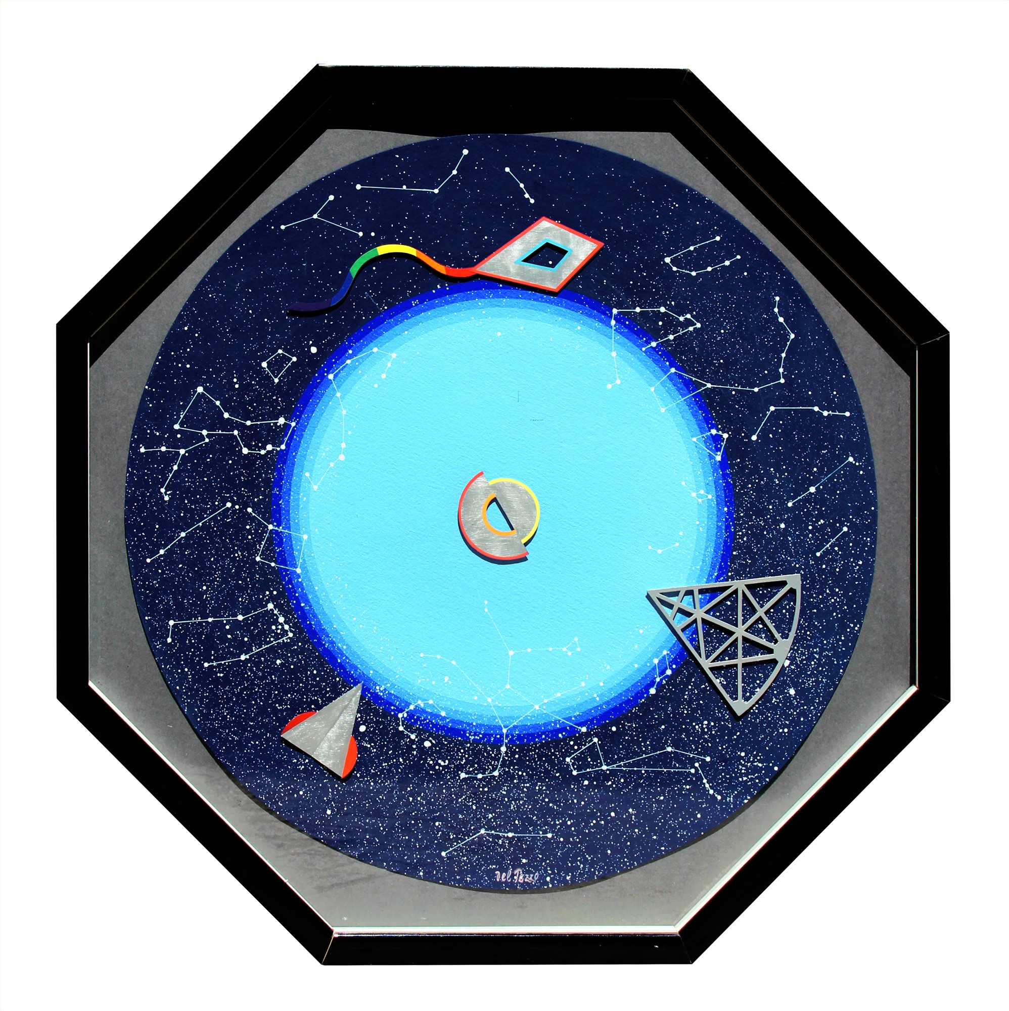 Lucio DEL PEZZO, Cielo con costellazioni (progetto per l'Allegra Costa), , collage, alluminio e acrilico su cartoncino, cm Ø 56