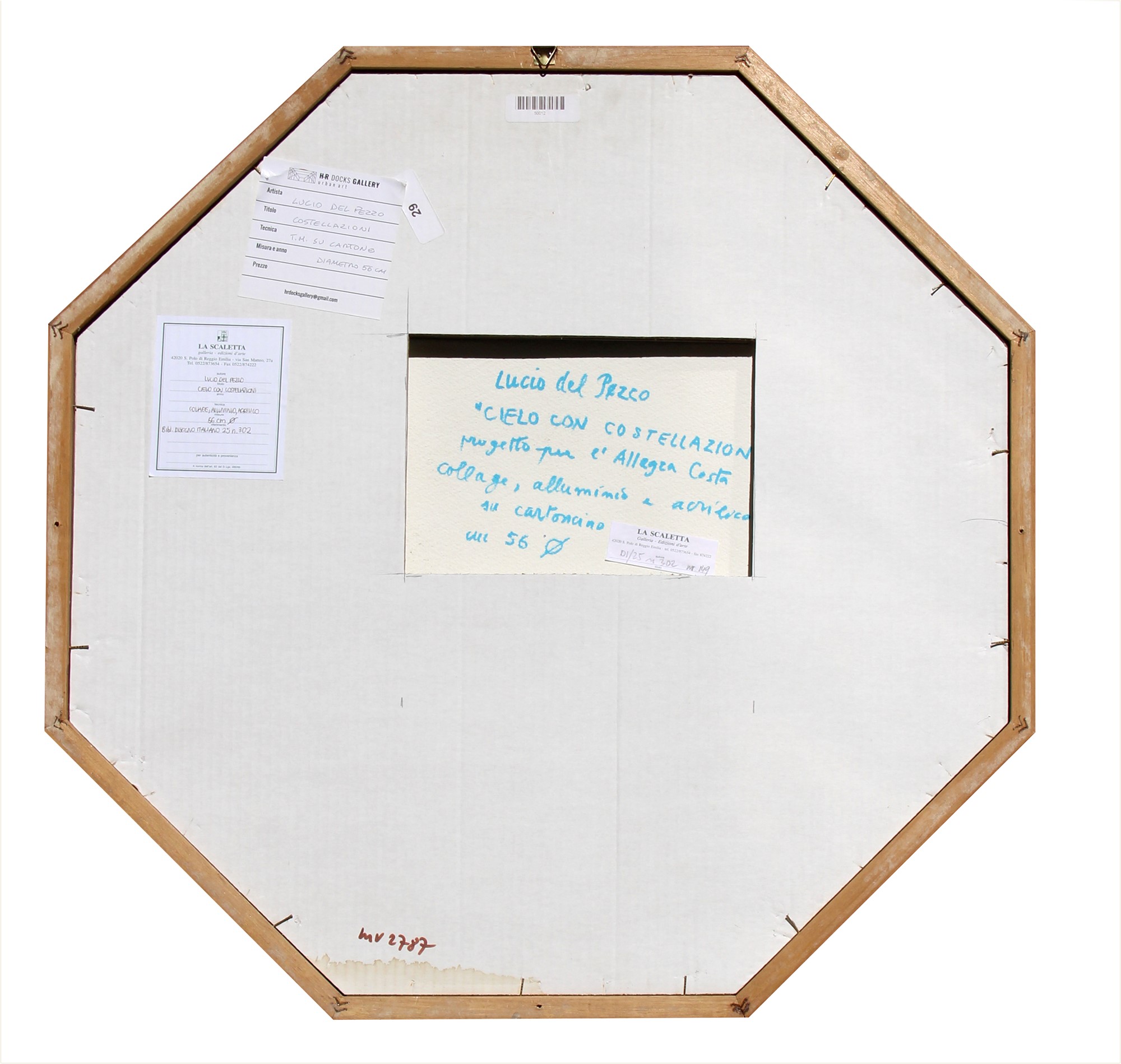 Firma, titolo, tecnica, misura "Lucio Del Pezzo, Cielo con costellazioni, progetto per l'Allegra Costa, collage, alluminio e acrilico su cartoncino, cm 56 Ø";
