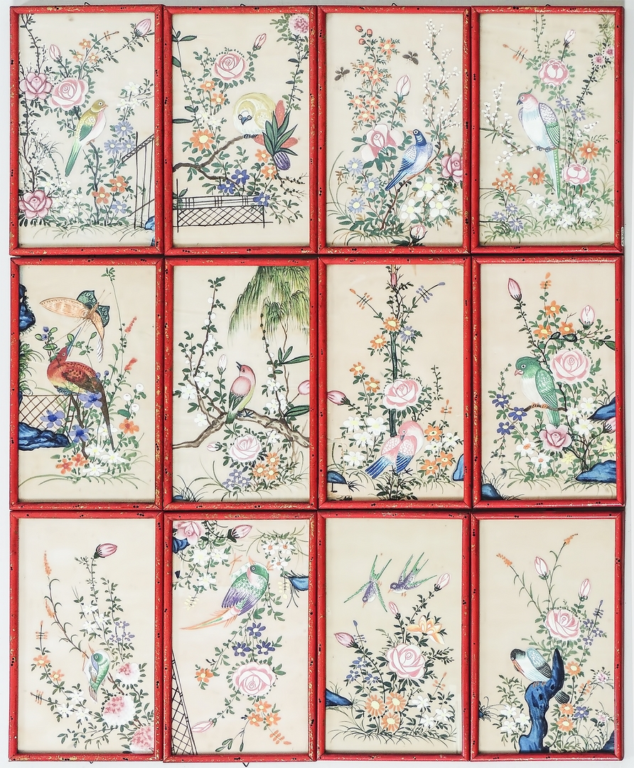 COMPOSIZIONI FLOREALI E UCCELLINI - COMPOSITIONS WITH FLOWERS AND BIRDS Cina, inizio del XX secolo - China, beginning of 20th Century serie di dodici dipinti a tecnica mista su seta - twelve mixed media on silk, in cornice cm 21x13