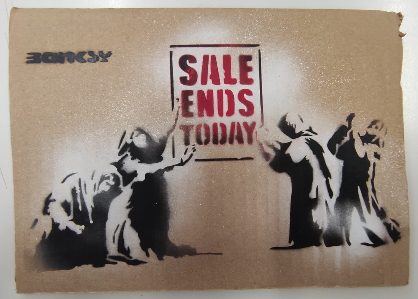 Firma a stencil in basso a destra, scritta e tiratura al verso: ‘Enjoy your free art!!!’ esemplare 6/25, timbro Dismaland Bemusement Park. Biglietto d’ingresso di Dismaland, Bemusement Park