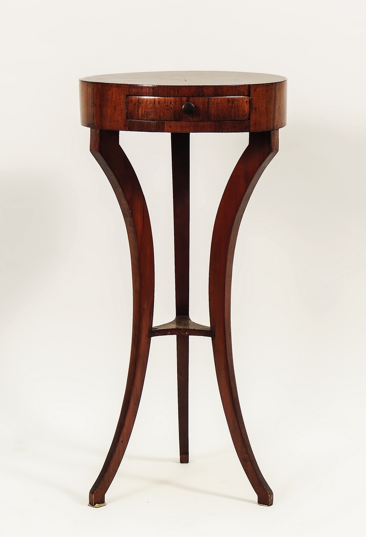 GUERIDON IMPIALLACCIATO IN NOCE - WALNUT VENEERED COFFEE TABLE fine del XIX/inizio del XX secolo - late 19th/early 20th Century un cassettino nella fascia, tre gambe a sciabola riunite da piccolo ripiano triangolare, difetti h cm 73, diam cm 38