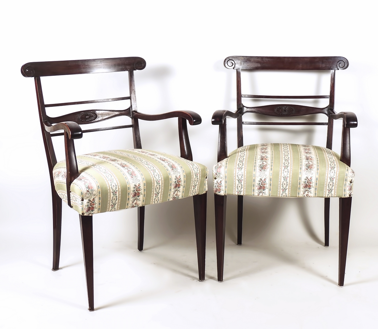 COPPIA DI POLTRONCINE IN MOGANO - PAIR OF MAHOGANY ARMCHAIRS braccioli mossi a giorno, gambe a faretra
