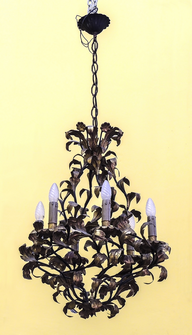 LAMPADARIO IN METALLO DORATO - GILT METAL CHANDELIER modellato con motivi vegetali, sei braccia portacandele h cm 70