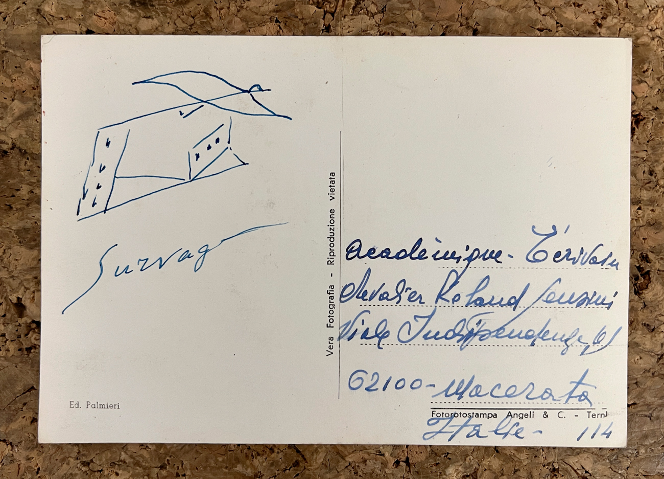 La cartolina è indirizzata dall'Artista al Cavaliere Rolando Sensini, Macerata