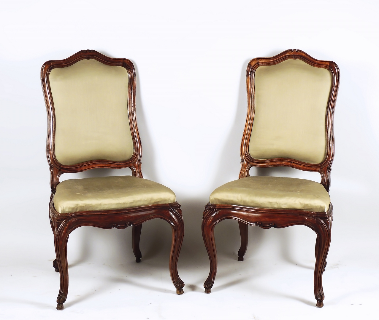 COPPIA DI SEDIE IN NOCE - PAIR OF WALNUT CHAIRS metà del XVIII secolo - mid 18th Century schienali sagomati, pendaglina e gambe anteriori mosse, piedini a ricciolo, rivestite in tessuto verde salvia
