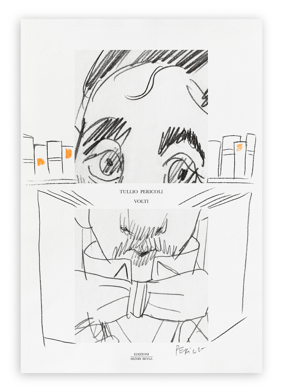 Intervento a pastelli colorati su manifesto 'Tullio Pericoli - Volti - Edizioni Henry Beyle'