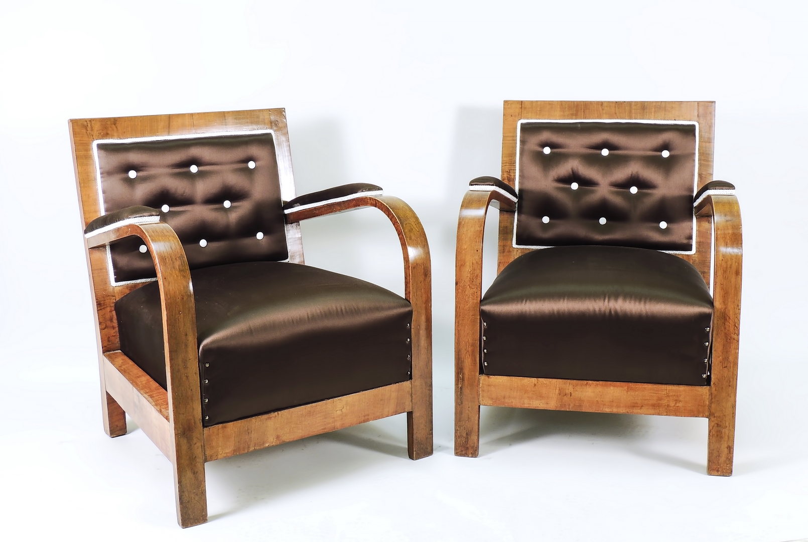 COPPIA DI POLTRONE DÉCO IN NOCE - PAIR OF WALNUT DECO ARMCHAIRS imbottite e rivestite in raso marrone