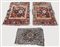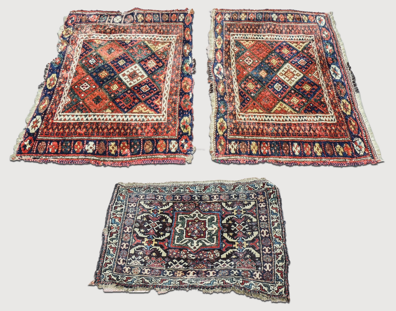 TRE TAPPETI DI VECCHIA MANIFATTURA - THREE OLD RUGS LOT una coppia di preghiere, fondo rosso mattone, campo a disegni geometrici nei toni del beige, blu e verde ed una sella cm 119x69 e cm 64x45