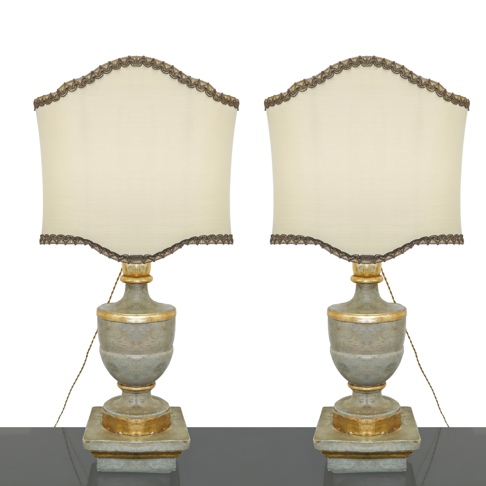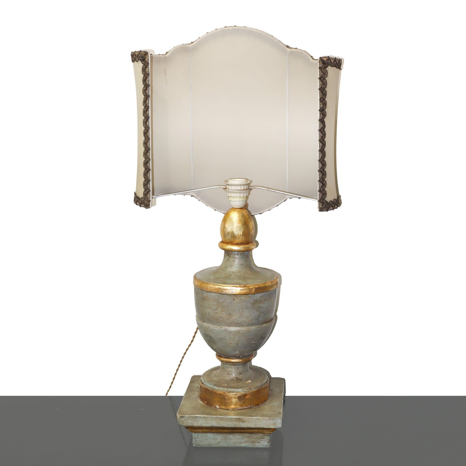 Coppia di Lumi in legno laccato azzurro/verde e dorato, nineteen° secolo h cm 50, con paralume h cm 87, base cm 20,5x21Con paralumeCon paralume