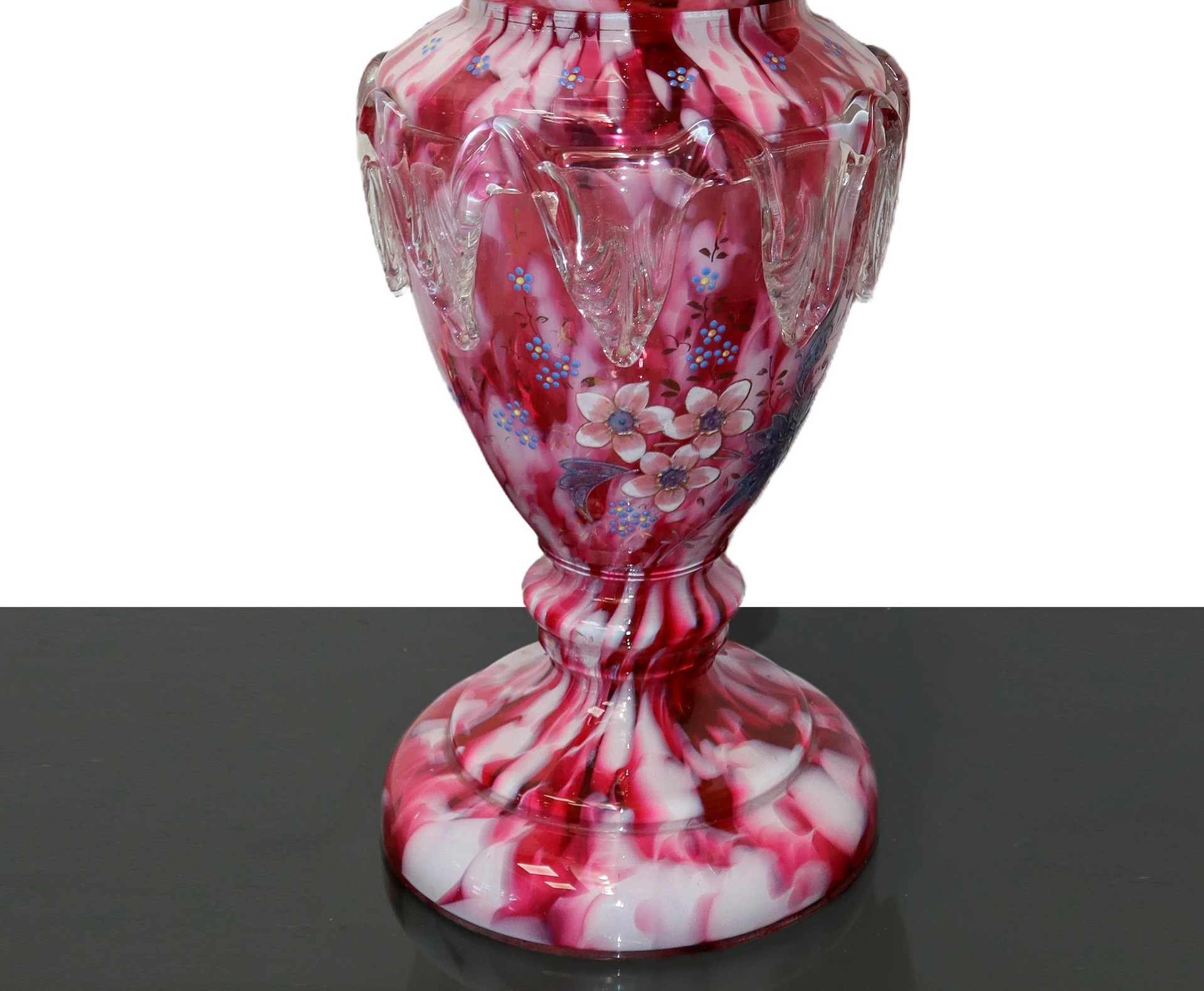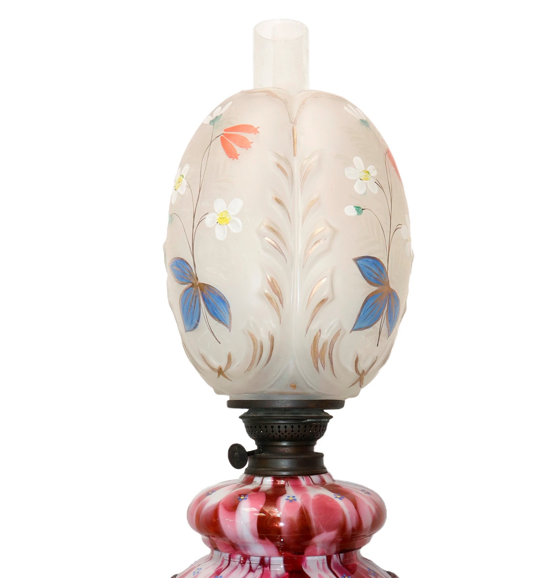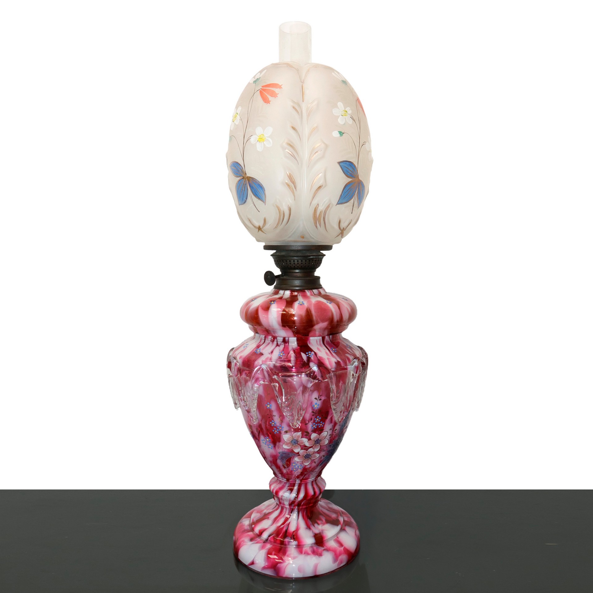 Lume in vetro rosa, fucsia e bianco con decorazioni floreali, 20° secolo H cm 66Decorazioni floreali sulla base e sulla boccia. Minima filatura sulla bocciaDecorazioni floreali sulla base e sulla boccia. Minima filatura sulla boccia