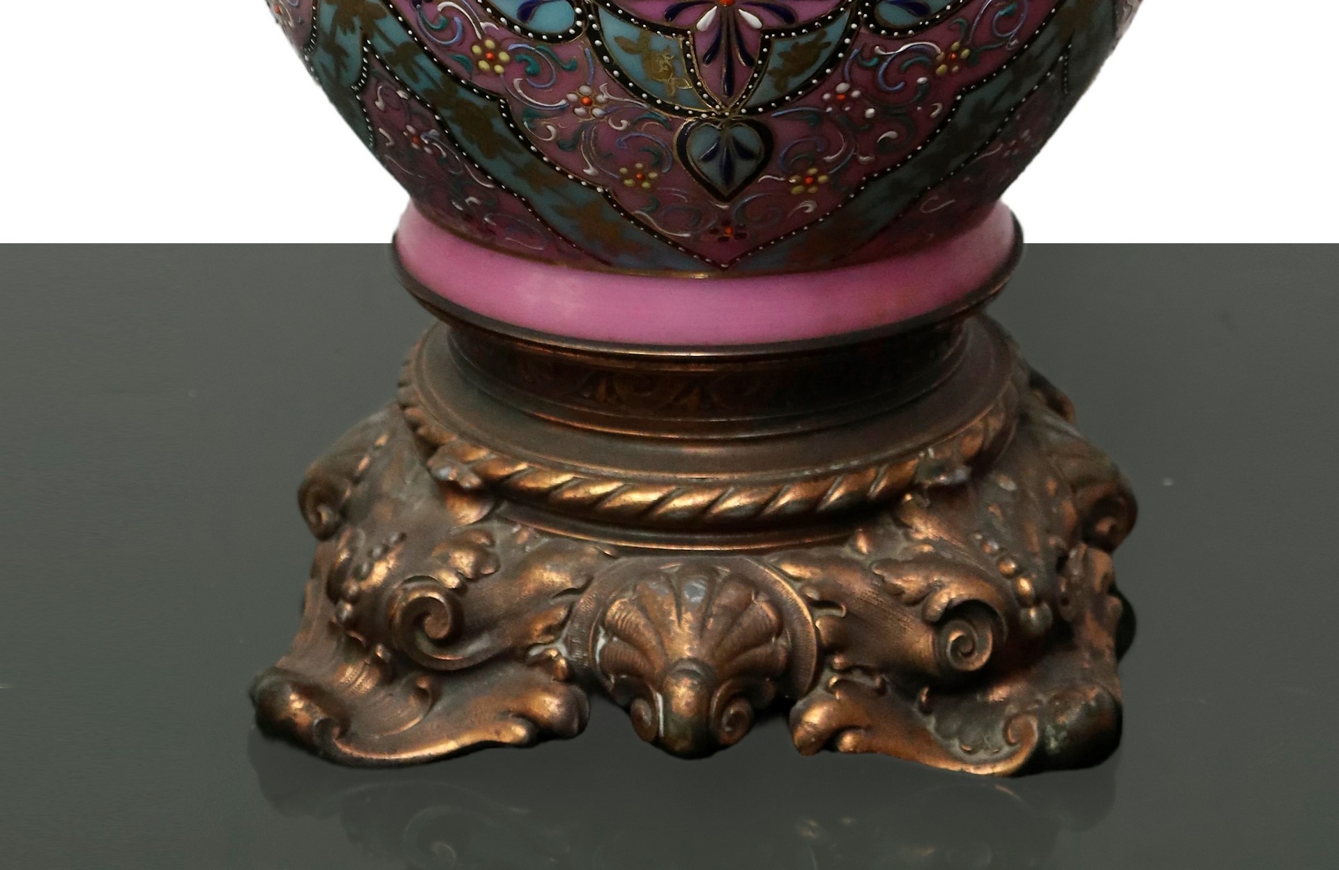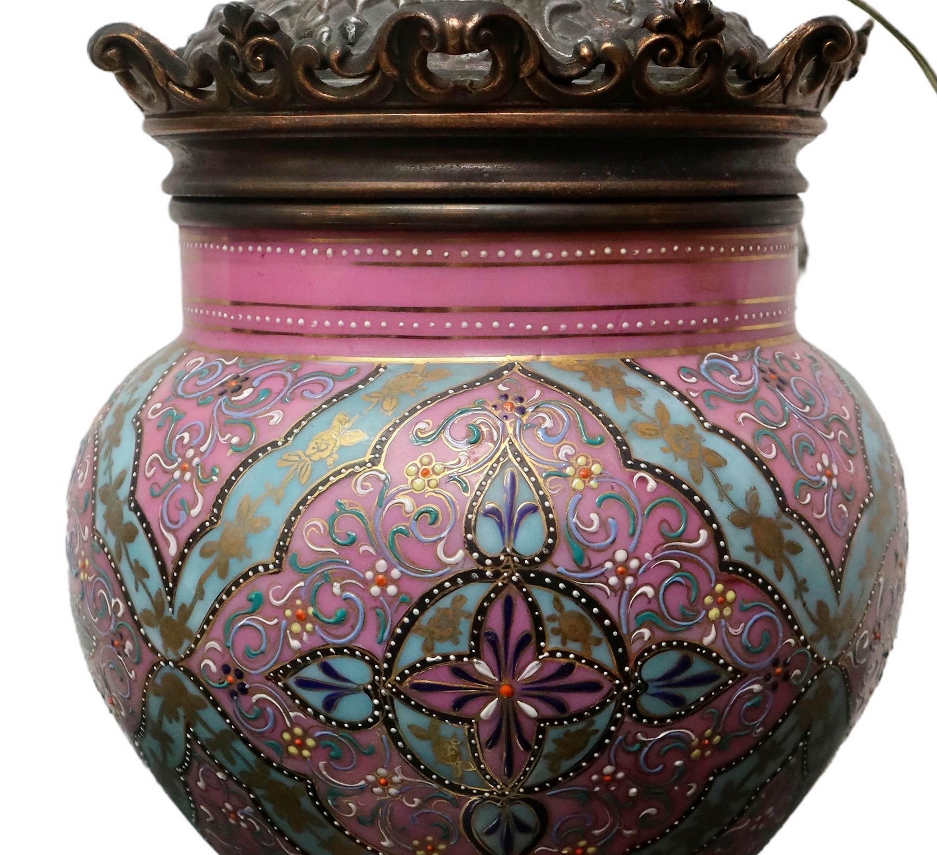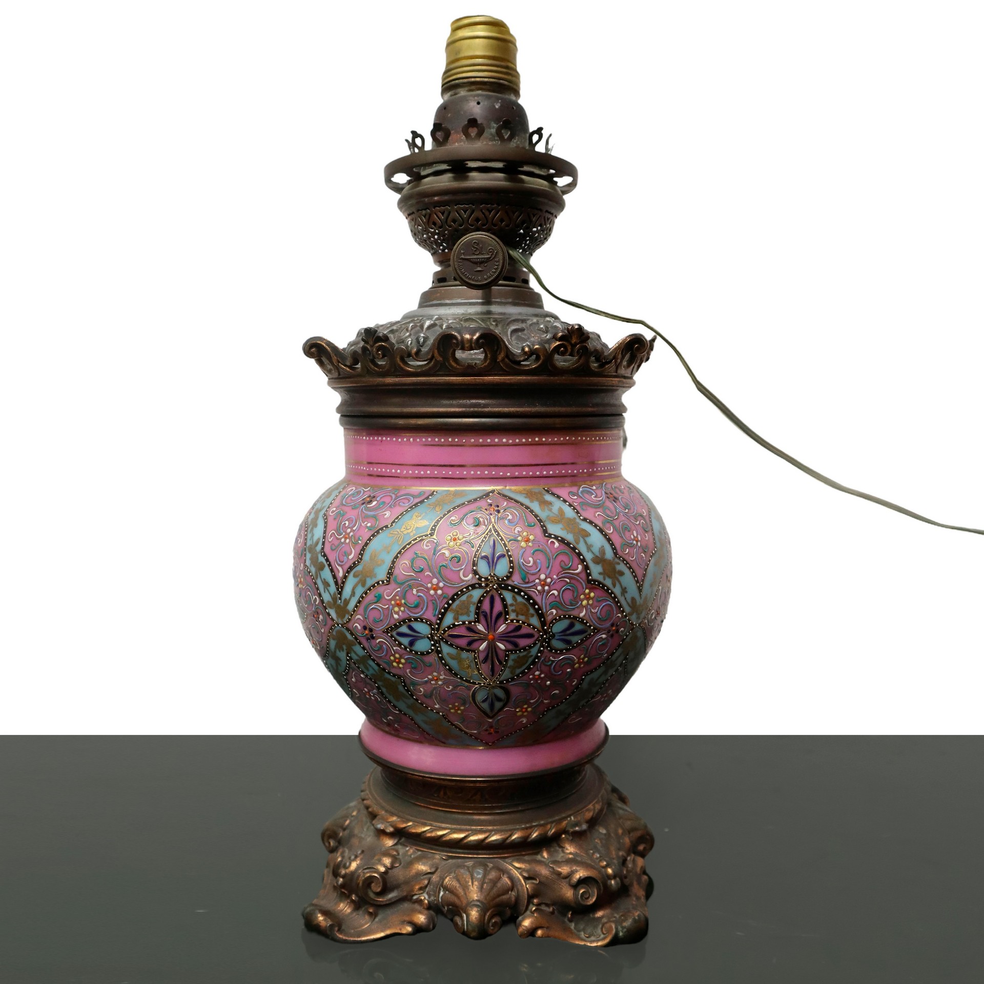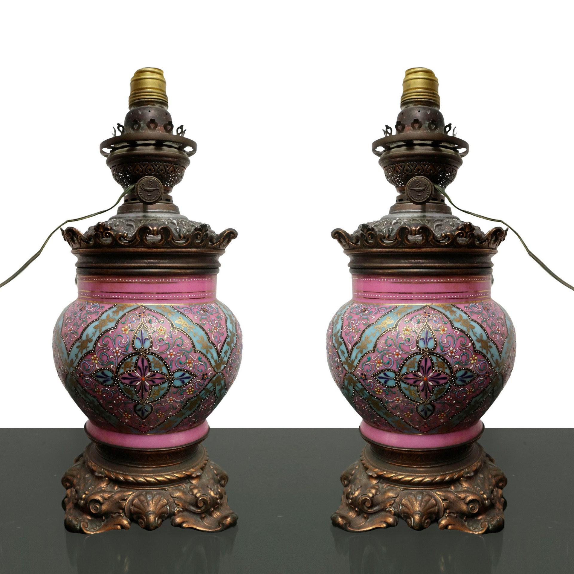 C. H. Stobwasser & Cº. Actien Gessellchaft (Berlino 1860) - Coppia di lumi a petrolio con base in metallo e corpo in porcellana con smalti nei toni del fucsia, verde tiffany e dorato, Tardo 19° secolo