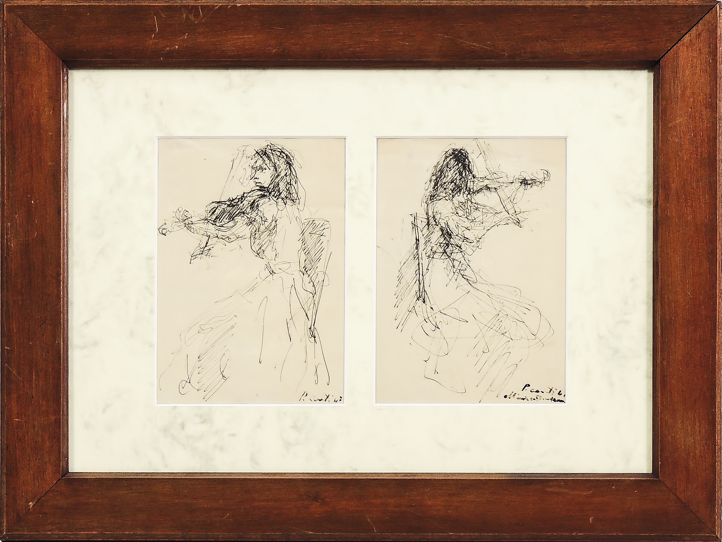PRIMO CONTI (1900-1988) Violiniste - Violinists coppia di bozzetti a china su carta - a pair of indian ink sketches on paper, firmati e datati 47, uno dedicato, in un'unica cornice ciascuno cm 17x21