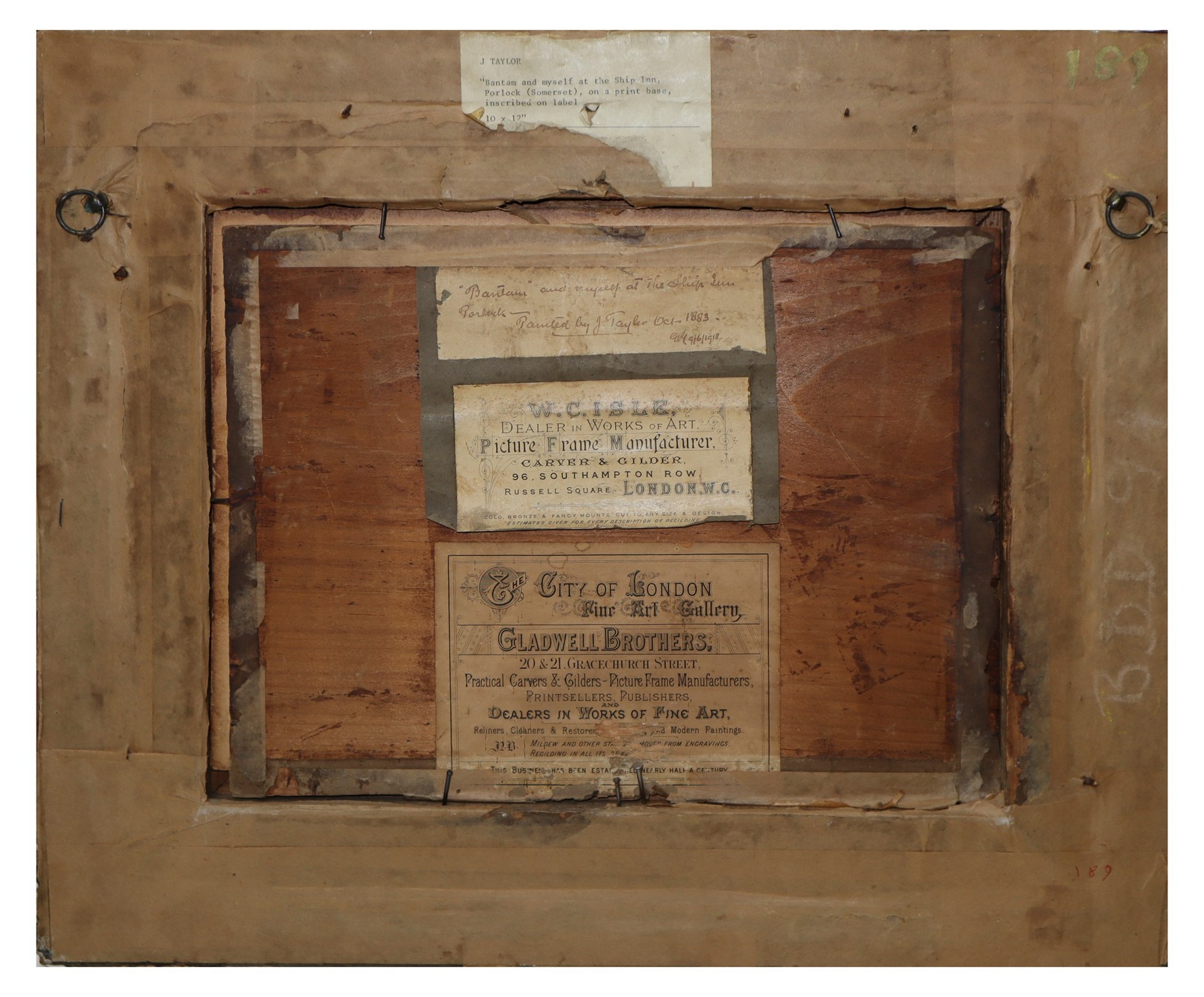 Uomo a cavallo, Tardo 19° secolo 10' x 12', cm 23.5 x 31.5, in cornice cm 40 x cm 47Olio su tavolettaTitolo indicato su etichetta sul retro "Bantam and myself at the Ship Inn, Porlock (Somerset)''