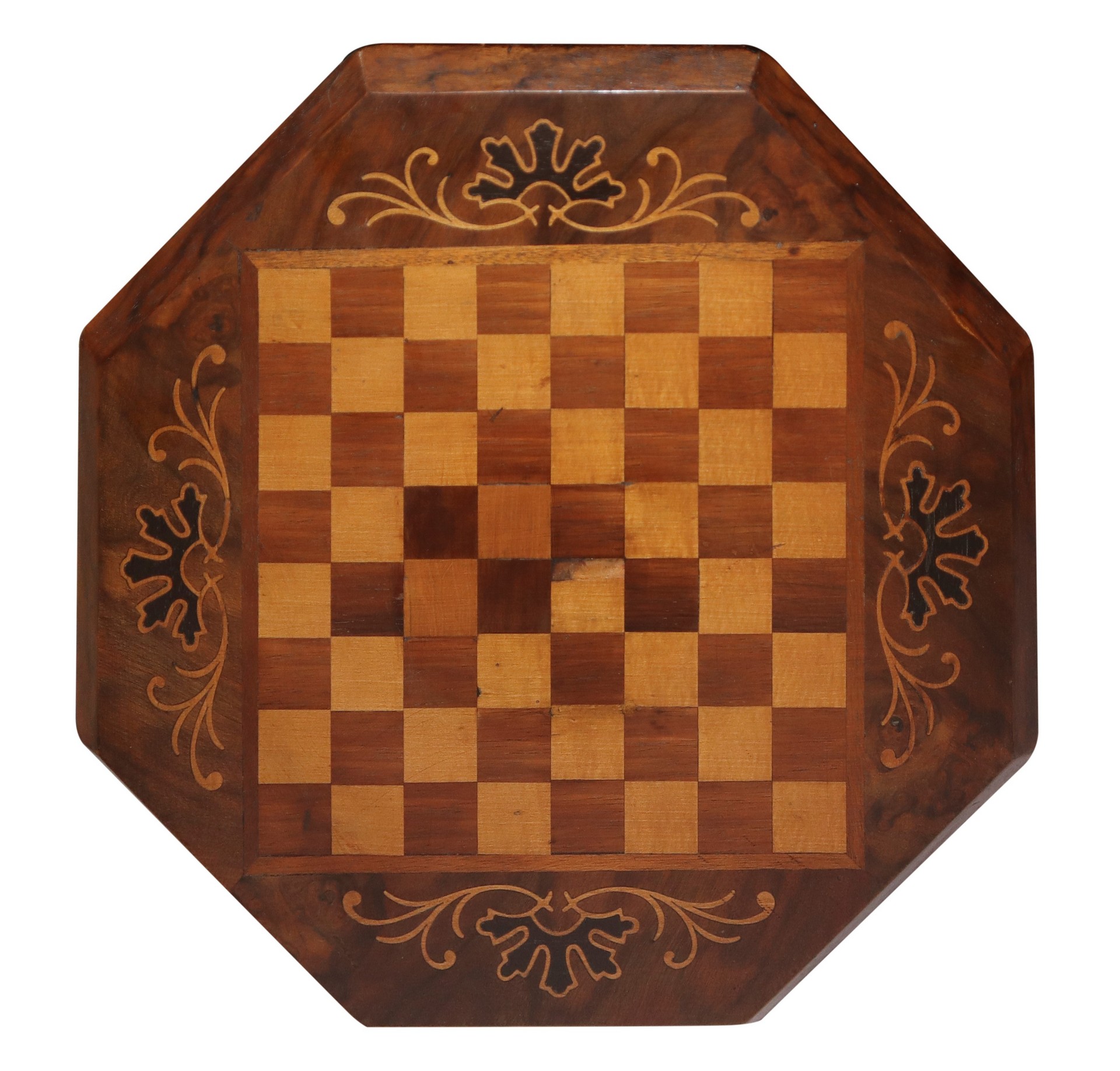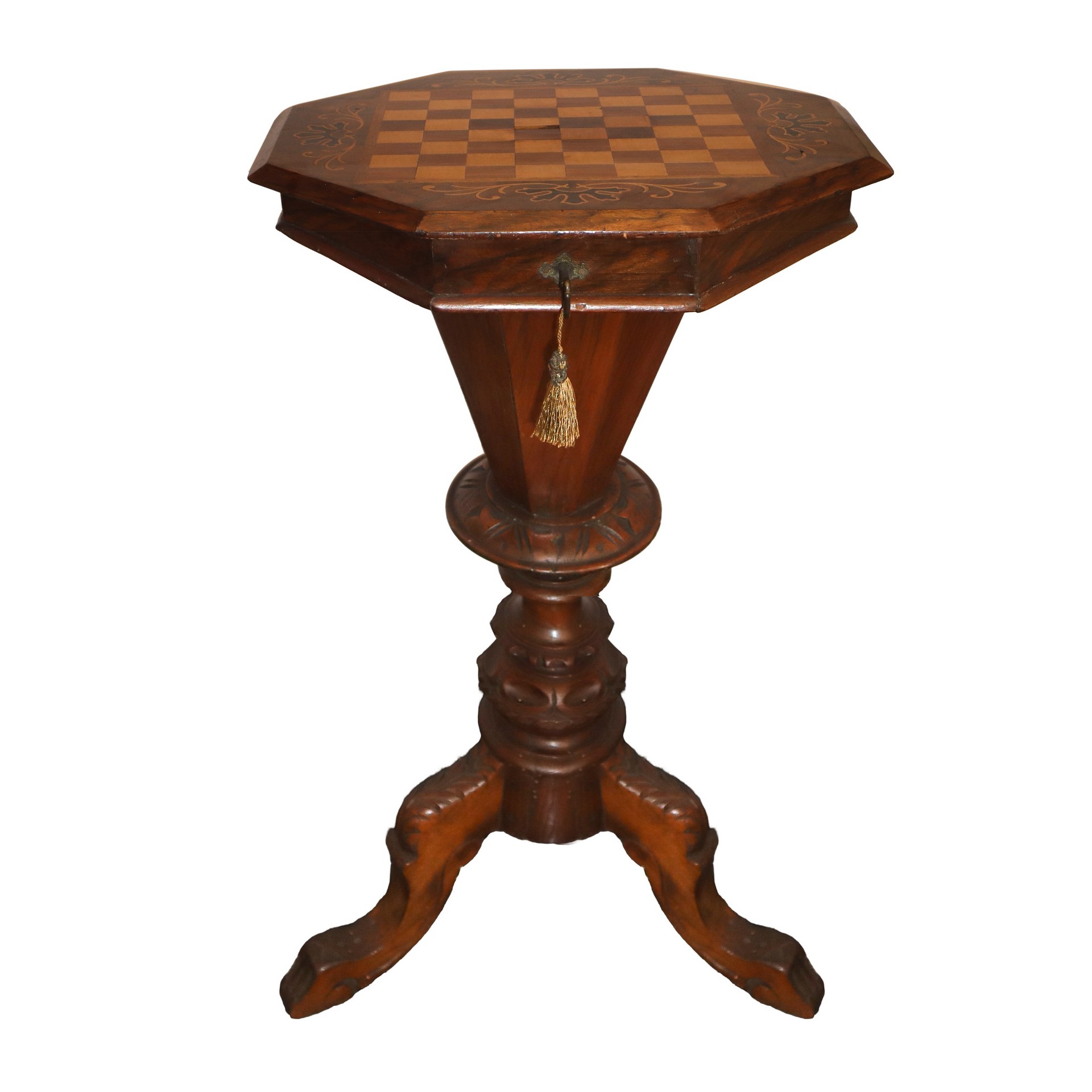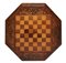 Tavolino da lavoro esagonale, nineteen° secolo Intarsio di gioco di dama al piano, piede a tre razze intagliato a a foglioIntarsio di gioco di dama al piano, piede a tre razze intagliato a a foglio