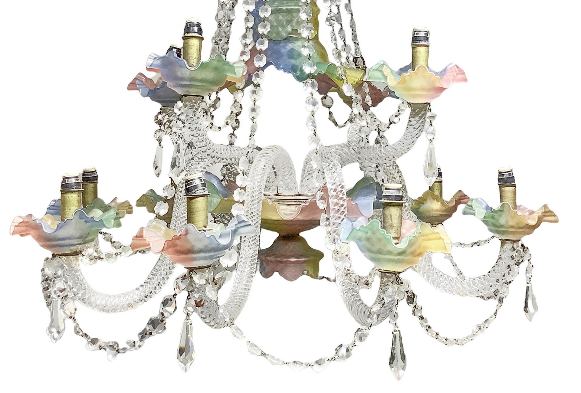 Elegante lampadario in cristallo Baccarat, nineteen° secolo h cm 80x90Bracci a torcion in cristallo trasparente, piattini in vetro colorato e brindoli a rosette, a 12 luci.Bracci a torcion in cristallo trasparente, piattini in vetro colorato e brindoli a rosette, a 12 luci.