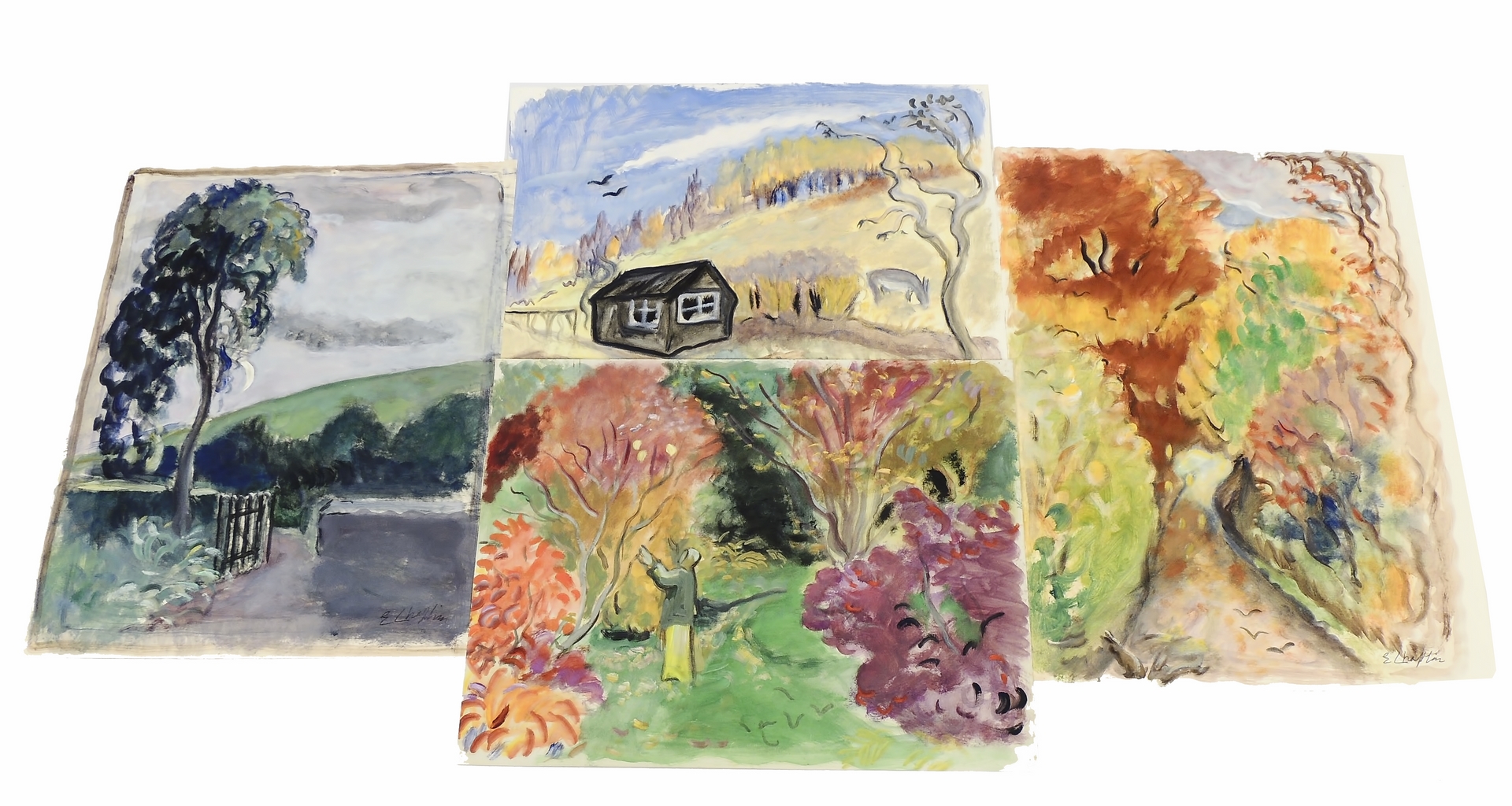 ELISABETH CHAPLIN (1890-1982) Paesaggi - Landscapes raccolta di quattro dipinti a tempera e acquerello su carta - four watercolour and tempera paintings on paper, tre firmati (4) cm 42x53, cm 57x45 e cm 48x60 Provenienza: Galleria Michelucci, Firenze